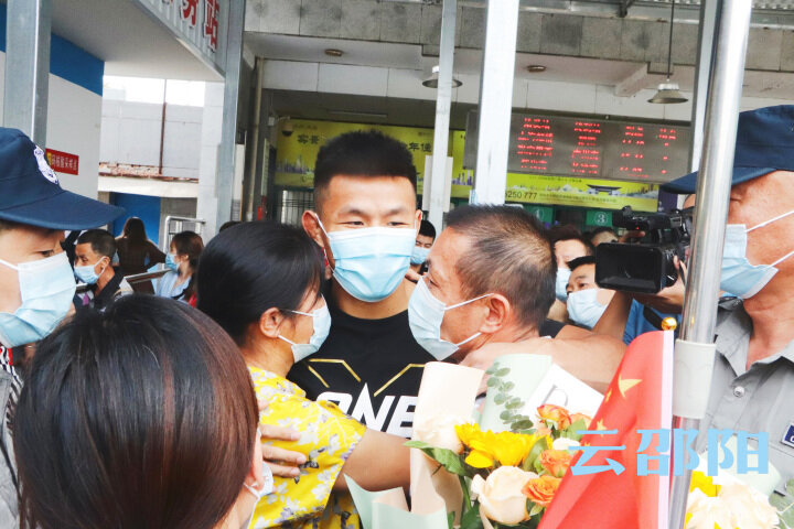 听说世界冠军载誉归乡的消息,唐凯的父母和众多粉丝早早地赶到邵阳火车站出站口迎接。现场迎接的粉丝热情高涨,举着牌子列队欢迎。“来了!来了!”21日下午2时30分许,邵阳火车站出站口,守候多时的迎接人群中突然传来一声吆喝,欢呼声随之响起,现场一片沸腾。看到唐凯走出出站口,他父母大步上前送上鲜花和深情的拥抱。