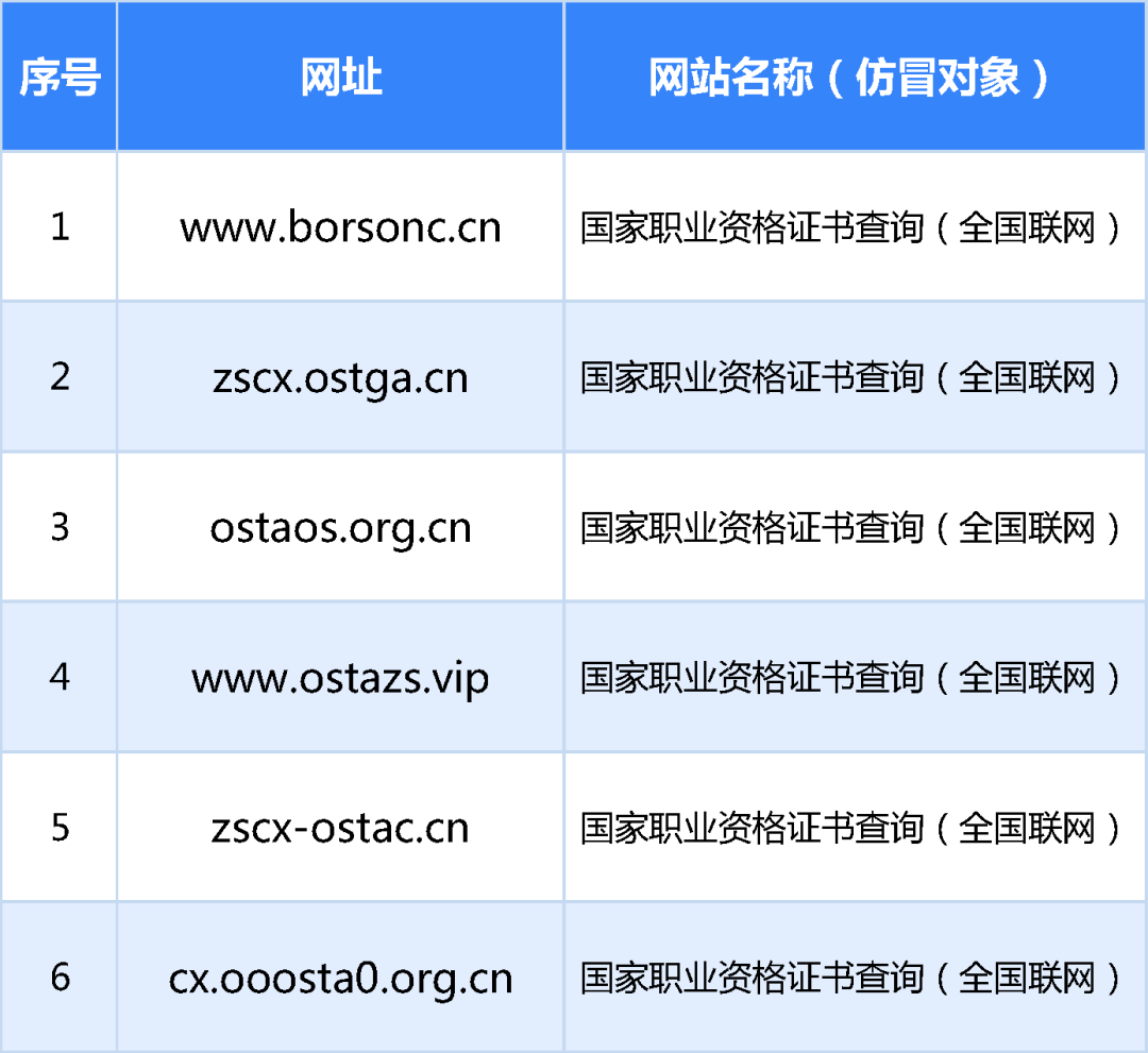 今年3月,人力资源社会保障部、中央网信办印发《关于开展技术技能类“山寨证书”网络治理工作的通知》,对技术技能类“山寨证书”进行网络治理。 根据网络巡查和群众举报情况,人力资源社会保障部联合有关部门查实并关停了14个仿冒网站。这些网站的名称、网址及页面内容与人力资源社会保障部技能类“职业资格证书”“职业技能等级证书”(以下简称技能类评价证书)查询官方网站高度相似,容易误导社会公众。 一起来看名单↓ 在此,提醒广大考生务必提高辨别能力,人力资源社会保障部认可的技能类评价证书可通过技能人才评价工作网(www.osta.org.cn 和 osta.mohrss.gov.cn)查询。 来源:湘微教育 |