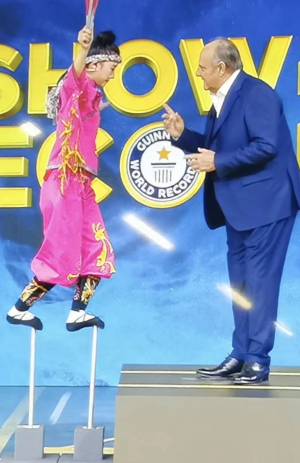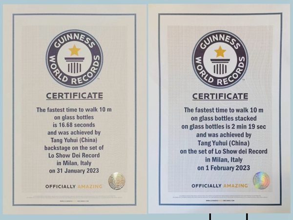(题记)刀上花木兰,赤脚走刀锋。飒爽巾帼姿,技惊天下雄! (中国刀上花木兰唐羽荟在意大利米兰挑战超高难度的速走双层无固定空心瓶吉尼斯世界纪录)) (文/罗文骅)万里赴戎机,关山度若飞。日前,当中国人尚沉浸在新春佳节的喜悦氛围中时,中国绝技功夫之星、“刀上花木兰”唐羽荟在中国民间杰出文化传承人、师傅吉靖羽的陪同下,应意大利国家电视台和英国吉尼斯总部邀约,飞行一万多公里,远征英国吉尼斯世界纪录集结地——意大利米兰战场,于1月31日以16.68秒轻松打破多国高手参与的速走十米单层无固定空心啤酒瓶的吉尼斯世界纪录,紧接在2月1日又创建了超高难度的10米速走无固定双层(重叠)空心啤酒瓶新的吉尼斯世界纪录!来自中国贵州的苗族女孩唐羽荟再次惊艳国际赛场。