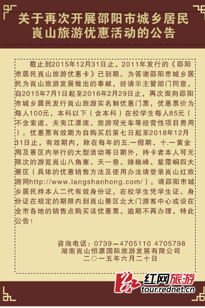(崀山景区再次向邵阳市城乡居民发行崀山旅游实名制优惠门票通知。) 红网长沙6月30日讯(记者 戴科)湖南崀山恒源国际旅游发展有限公司今日发布消息,因截至2015年12月31日,2011年发行的《邵阳市居民崀山旅游优惠卡》将停止使用,为便利优惠邵阳市城乡居民,自2015年7月1日起至2016年2月29日止,将再次向邵阳市城乡居民发行崀山旅游实名制优惠门票,优惠票价为每人100元,学生本科以下(含本科)在校学生每人85元(不含索道、夫夷江漂流、旅游观光车等经营性项目费用)。景区工作人员提示,崀山景区北大门游客中心和设在全市各地的销售点都可购买优惠门票。需要注意的是,邵阳市城乡居民需持本人二代有效身份证;在校学生需凭学生证、身份证并在规定的期限内购买优惠票,逾期不再办理。 优惠票有效期为自购买后第七日起至2018年12月31日止,在有效期内,除在每年的“五.一”假期、“十.一”黄金周及景区内举行的大型活动等日期外,持卡者本人可无限次的游览崀山八角寨、天一巷、辣椒峰、紫霞峒四大景区。 具体的优惠销售方法及使用办法请登录崀山红旅游网:http://www.langshanhong.com 咨询电话:0739-4705110;4705798 |