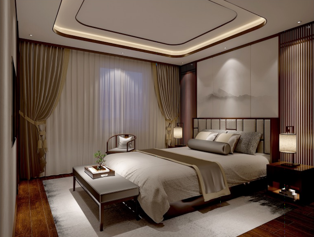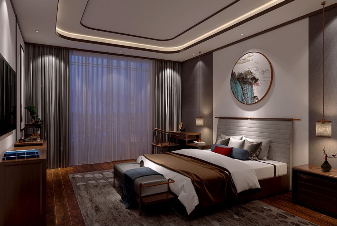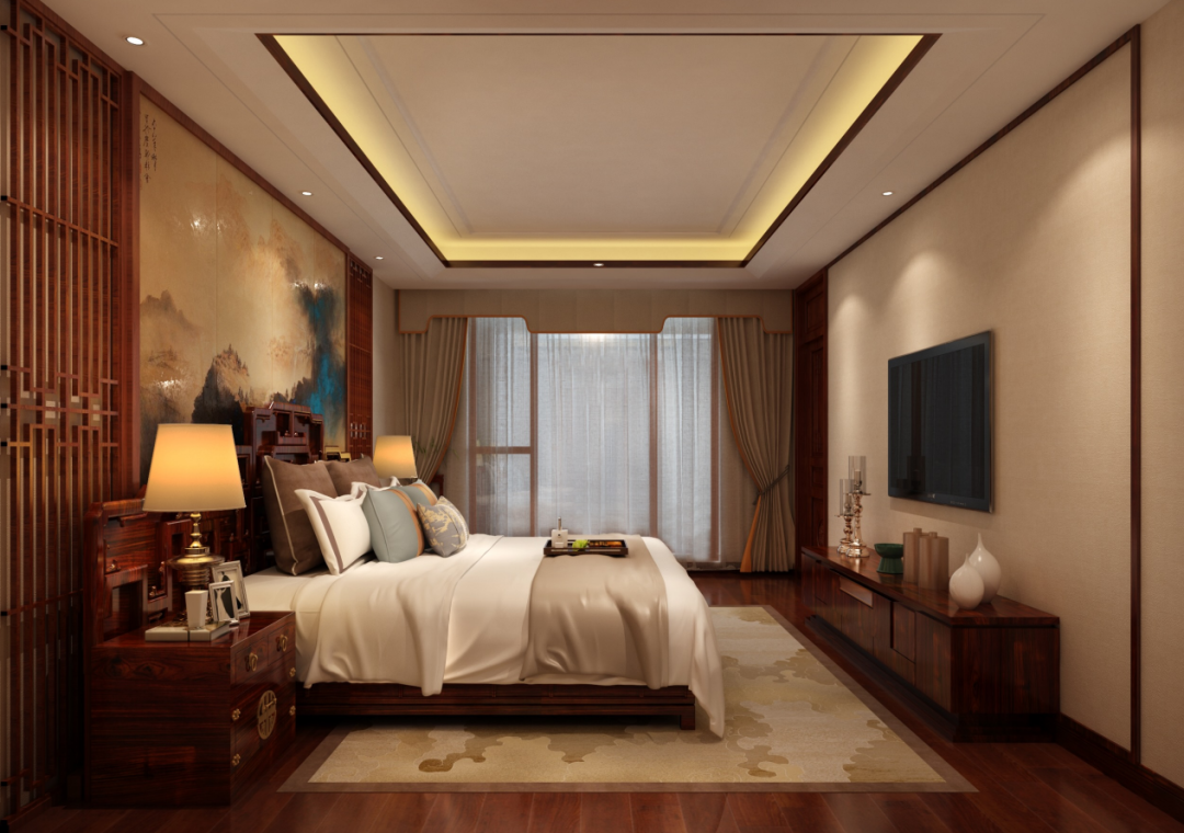 主卧的整体色调以高贵的红木色和现代轻奢的浅色系为主,与背景墙的泼彩山水画相得益彰,彰显质朴简美的新中式风格。 “户庭无尘杂,虚室有余闲”,窗明几净的卧室回归自我,故而“复得返自然”从容地享受人生。这是真实生活的写照,亦是生活的智慧。 |