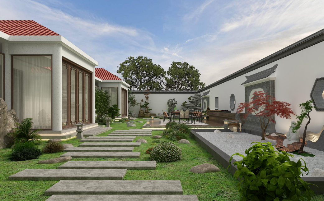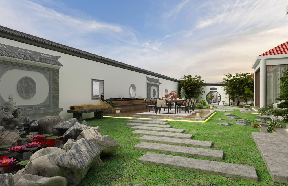 中西合璧是这套庭院的最大亮点,院子的另一侧采用西式现代园林置景手法,不规则的步石铺设在葱绿的草地上,步石的尽头连接着一个小型休闲区。清凉夏夜,邀请亲朋好友欢聚于此,尽情享受烧烤+啤酒带来的美食慰藉,何等畅快!