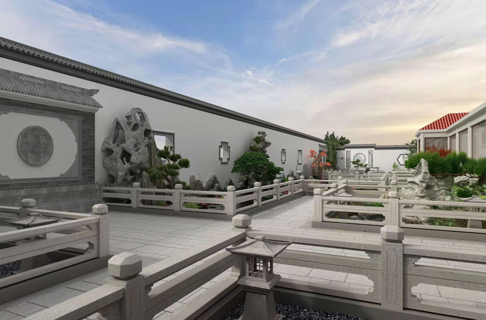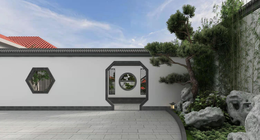 中式庭院讲究意境之美,松竹石是中式庭院中不可缺少的造景意象。 步入庭院首先映入眼帘的是,一脉葱茏松竹,掩映在素墙之旁,青瓦之下,与几尊奇石相配成景,清幽之气回环萦绕,更衬托出主人高洁坚毅的君子风度。 透过花窗和门洞,院内的景观若隐若现,颇有“园中有园、景外有景、移步换景”之妙,让人忍不住想走近一探究竟。