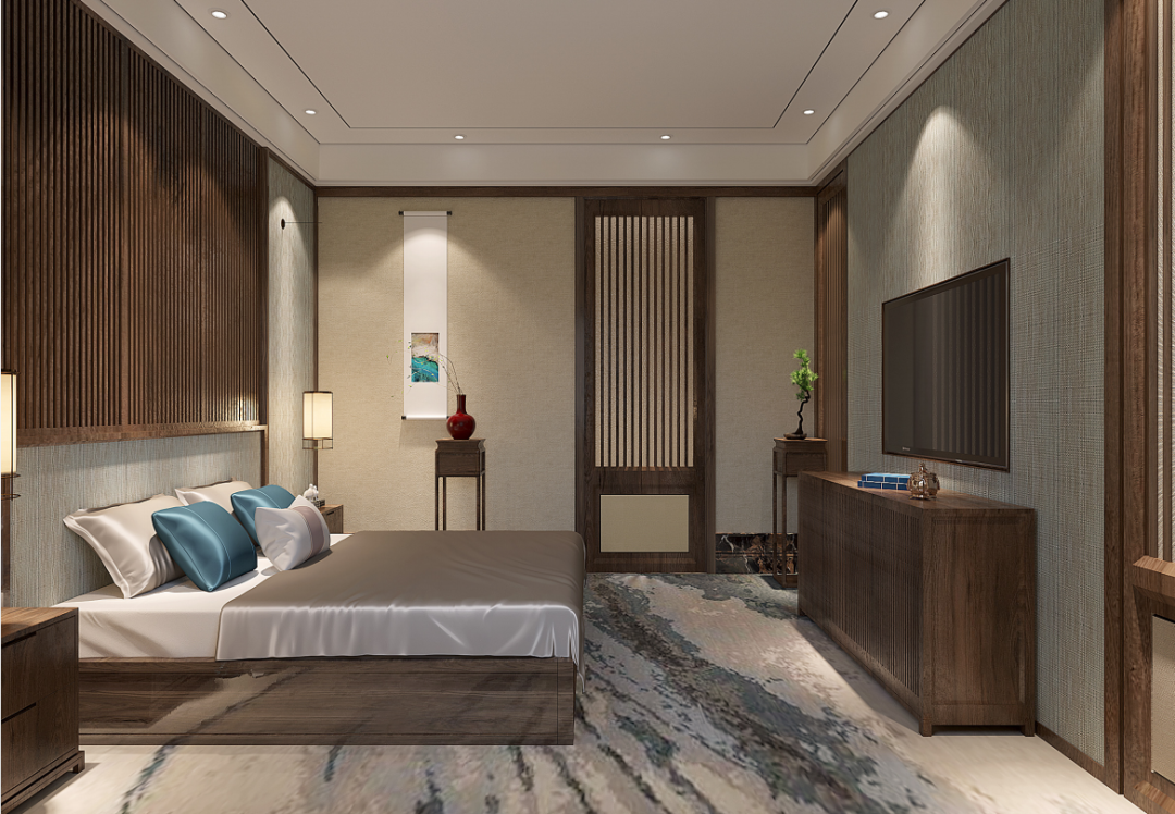 女孩房的设计多了一丝浪漫诗意的氛围。一进门便看到一席水墨画徐徐铺展开来,与飘逸的窗帘、浅色系的床品、柔和温暖的灯光等互相映衬,构筑出宁静而富有韵味的空间,好似“深林人不知,明月来相照”的山水画意境,端庄而优雅。