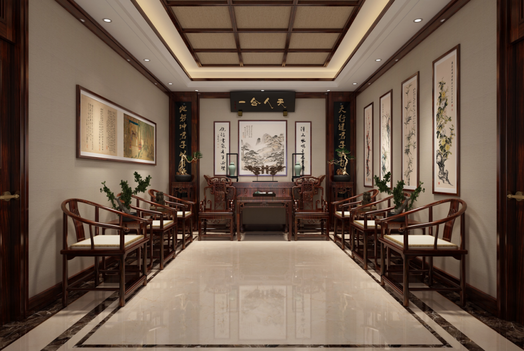 俗语有言:“堂屋有量不生灾,正堂宽敞出贵人”。古时的堂屋指代客厅,也是彰显家族荣光最为重要的区域。 设计师在设计上延续了传统堂屋的布局,墙壁上挂有中堂画,中堂两侧有对联,条案与太师椅组合,摆放于堂屋中轴线靠墙的位置,两边配线条简洁的新中式座椅,古香古韵的气息,为堂屋增添了几分庄重肃穆的氛围。 “天人合一”主题对联及山水画,与“梅兰竹菊”主题四联画,氤氲着主人“返璞归真”的人生追求,和清雅淡泊的君子之风。