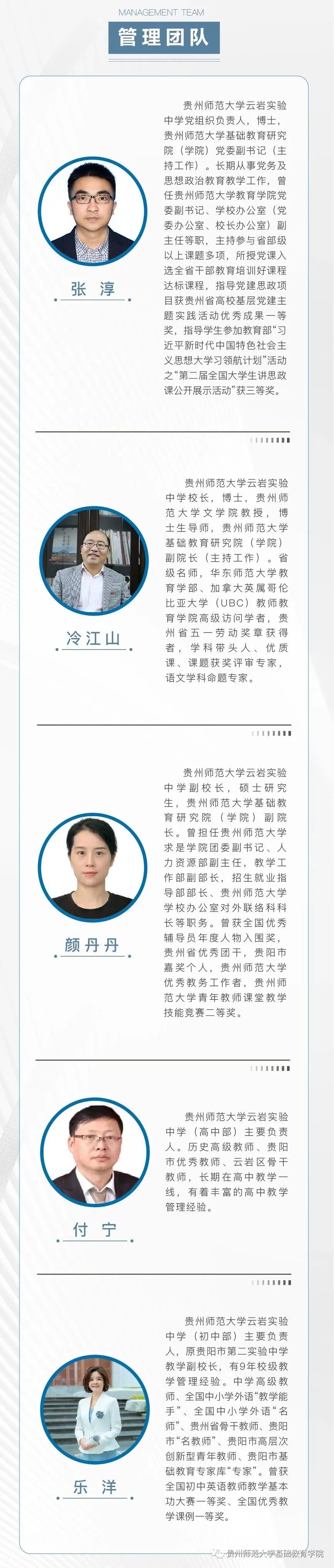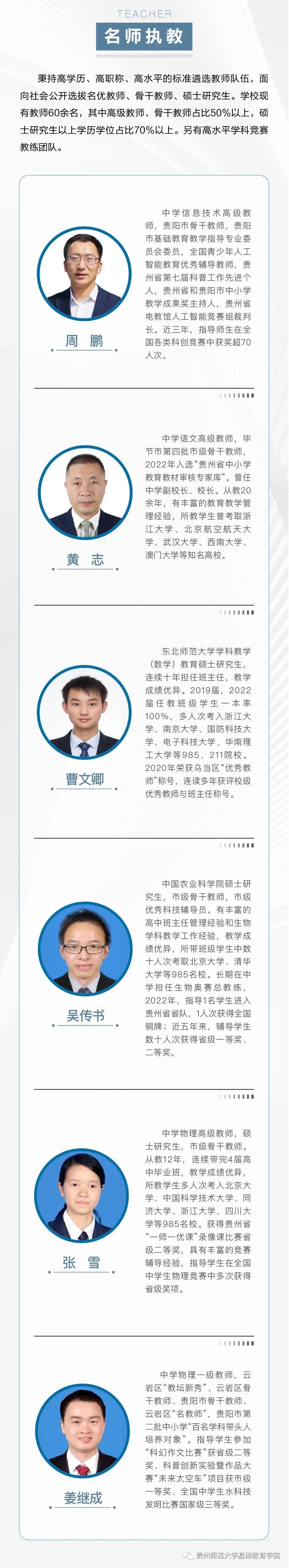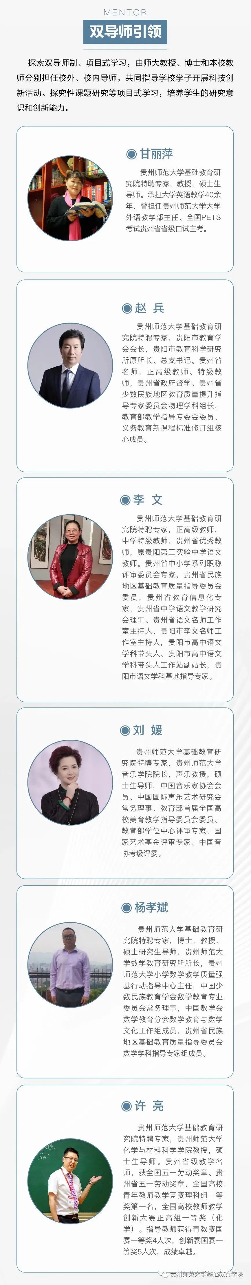 ![]() 据悉,学校积极推进基础教育人才培养模式改革创新,致力培养政治可靠、品德高尚、学业优良、身心健康、审美高雅、热爱劳动的社会主义事业建设者和接班人,努力建成学生向往、教师幸福、家长满意、社会认可的高质量品牌中学。 ![]() ![]() 吕传汉 贵州师范大学基础教育研究院学术委员会委员,教授,曾任贵州师范大学副校长和兼任教育部第二届高等学校数学力学教学指导委员会委员、贵州省教育学会副会长等职;现任贵州省普通高中课程改革专家组组长、贵州师范大学基础教育师资培训中心专家组组长。享受国务院政府特殊津贴,2018年获国家级基础教育教学成果一等奖。 谢晓尧 贵州师范大学基础教育研究院学术委员会委员,博士,二级教授,博士生导师,贵州省政协原副主席、贵州师范大学原副校长、贵州师范大学FAST早期数据科学中心、中国天眼联合研究中心·贵州师范大学分中心主任。著名信息技术专家、贵州首批省管专家、贵州首批核心专家、国家863项目专家库成员、中国计算机学会微机专业委员会委员、全国高校计算机教学研究会理事、国务院特殊津贴获得者、全国优秀科技工作者、贵州省最高科学技术奖获得者、贵州籍南极科考第一人。 肖江虹 贵州师范大学基础教育研究院学术委员会委员,当代作家,中国作协全委会委员。在《当代》《收获》《十月》《人民文学》《钟山》《天涯》《山花》等刊物发表各类文学作品三百余万字,有作品被《小说选刊》《新华文摘》《小说月报》等选载和入选各类选本。曾获鲁迅文学奖、十月文学奖、人民文学奖、小说选刊年度奖、华语青年作家奖、贵州省政府文艺奖等。 双导师引领项目式学习 贵州师范大学云岩实验中学探索双导师制、项目式学习,由师大教授、博士和本校教师分别担任校外、校内导师,共同指导学校学子开展科技创新活动、探究性课题研究等项目式学习,培养学生的研究意识和创新能力。同时双方选派优质管理骨干组建管理团队,全面组织实施教育教学各项工作。 甘丽萍 贵州师范大学基础教育研究院特聘专家,教授,硕士生导师。承担大学英语教学40余年,曾担任贵州师范大学大学外语教学部主任、全国PETS考试贵州省省级口试主考。 赵兵 贵州师范大学基础教育研究院特聘专家,贵阳市教育学会会长,贵阳市教育科学研究所原所长、总支书记。贵州省名师、正高级教师、特级教师,贵州省政府督学、贵州省少数民族地区教育质量提升 指导专家委员会物理学科组长,教育部教学指导专委会委员、义务教育新课程标准修订组核心成员。 李文 贵州师范大学基础教育研究院特聘专家,正高级教师,中学特级教师,贵州省优秀教师,原贵阳第三实验中学语文教师。贵州省中小学系列职称评审委员会专家,贵州省民族地区基础教育质量指导委员会委员,贵州省教育信息化专家,贵州省中学语文教学研究会理事。贵州省语文名师工作室主持人,贵阳市李文名师工作室主持人,贵阳市高中语文学科带头人、贵阳市高中语文学科带头人工作站副站长,贵阳市语文学科基地指导专家。 刘媛 贵州师范大学基础教育研究院特聘专家,贵州师范大学音乐学院院长,声乐教授,硕士生导师,中国音乐家协会会员、中国国际声乐艺术研究会常务理事、教育部首届全国高校美育教学指导委员会委员、教育部学位中心评审专家、国家艺术基金评审专家、中国音协考级评委。 杨孝斌 贵州师范大学基础教育研究院特聘专家,博士、教授、硕士研究生导师,贵州师范大学数学教育研究所所长,贵州师范大学小学数学教学质量强基行动指导中心主任,中国少数民族教育学会数学教育专业委员会常务理事,中国数学会数学教育分会数学教育与数学文化工作组成员,贵州省民族地区基础教育质量指导委员会数学学科指导专家组成员。 许亮 贵州师范大学基础教育研究院特聘专家,贵州师范大学化学与材料科学学院教授,硕士生导师。贵州省级教学名师,获全国五一劳动奖章、贵州省五一劳动奖章,全国高校青年教师教学竞赛理科组一等奖第一名,全国高校教师教学创新大赛正高组一等奖(化学)。指导教师获得青教赛国赛一等奖4人次,创新赛国赛一等奖5人次,成绩卓越。 专家坐镇管理团队 贵州师范大学云岩实验中学党组织负责人,博士,贵州师范大学基础教育研究院(学院)党委副书记(主持工作)。长期从事党务及思想政治教育教学工作,曾任贵州师范大学教育学院党委副书记、学校办公室(党委办公室、校长办公室)副主任等职,主持参与省部级以上课题多项,所授党课入选全省干部教育培训好课程达标课程,指导党建思政项目获贵州省高校基层党建主题实践活动优秀成果一等奖。 冷江山 贵州师范大学云岩实验中学校长,博士,贵州师范大学文学院教授,博士生导师,贵州师范大学基础教育研究院(学院)副院长(主持工作)。省级名师,华东师范大学教育学部、加拿大英属哥伦比亚大学(UBC)教师教育学院高级访问学者,贵州省五一劳动奖章获得者,学科带头人、优质课、课题获奖评审专家,语文学科命题专家。 颜丹丹 贵州师范大学云岩实验中学副校长,硕士研究生,贵州师范大学基础教育研究院(学院)副院长。曾担任贵州师范大学求是学院团委副书记、人力资源部副主任,教学工作部副部长,招生就业指导部部长、贵州师范大