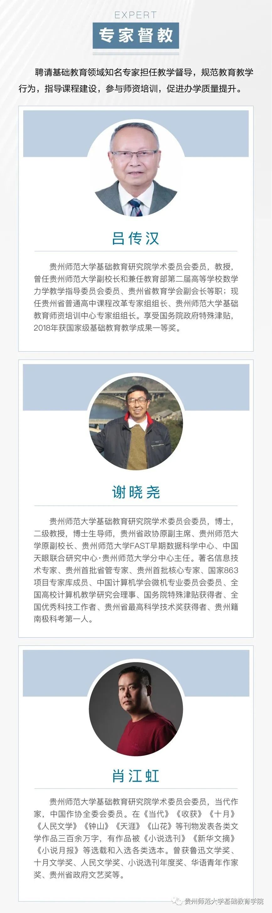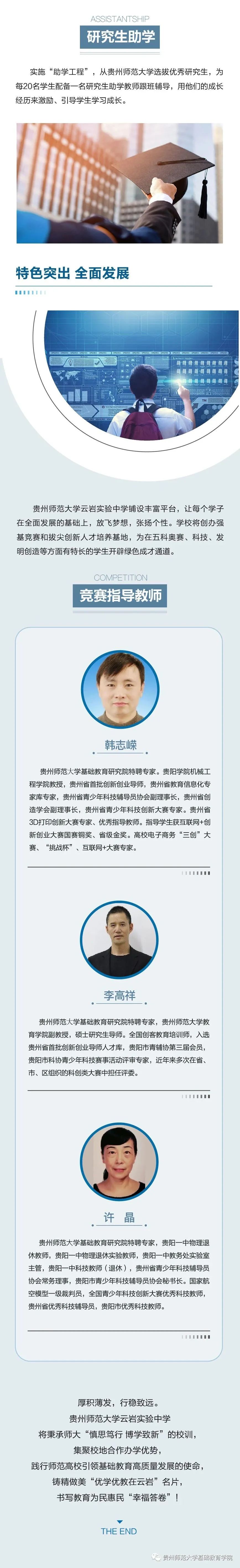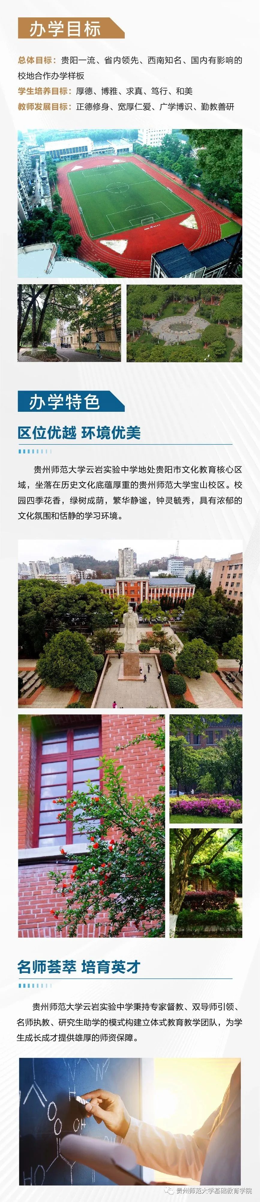 ![]() 据悉,学校积极推进基础教育人才培养模式改革创新,致力培养政治可靠、品德高尚、学业优良、身心健康、审美高雅、热爱劳动的社会主义事业建设者和接班人,努力建成学生向往、教师幸福、家长满意、社会认可的高质量品牌中学。 ![]() ![]() 吕传汉 贵州师范大学基础教育研究院学术委员会委员,教授,曾任贵州师范大学副校长和兼任教育部第二届高等学校数学力学教学指导委员会委员、贵州省教育学会副会长等职;现任贵州省普通高中课程改革专家组组长、贵州师范大学基础教育师资培训中心专家组组长。享受国务院政府特殊津贴,2018年获国家级基础教育教学成果一等奖。 谢晓尧 贵州师范大学基础教育研究院学术委员会委员,博士,二级教授,博士生导师,贵州省政协原副主席、贵州师范大学原副校长、贵州师范大学FAST早期数据科学中心、中国天眼联合研究中心·贵州师范大学分中心主任。著名信息技术专家、贵州首批省管专家、贵州首批核心专家、国家863项目专家库成员、中国计算机学会微机专业委员会委员、全国高校计算机教学研究会理事、国务院特殊津贴获得者、全国优秀科技工作者、贵州省最高科学技术奖获得者、贵州籍南极科考第一人。 肖江虹 贵州师范大学基础教育研究院学术委员会委员,当代作家,中国作协全委会委员。在《当代》《收获》《十月》《人民文学》《钟山》《天涯》《山花》等刊物发表各类文学作品三百余万字,有作品被《小说选刊》《新华文摘》《小说月报》等选载和入选各类选本。曾获鲁迅文学奖、十月文学奖、人民文学奖、小说选刊年度奖、华语青年作家奖、贵州省政府文艺奖等。 双导师引领项目式学习 贵州师范大学云岩实验中学探索双导师制、项目式学习,由师大教授、博士和本校教师分别担任校外、校内导师,共同指导学校学子开展科技创新活动、探究性课题研究等项目式学习,培养学生的研究意识和创新能力。同时双方选派优质管理骨干组建管理团队,全面组织实施教育教学各项工作。 甘丽萍 贵州师范大学基础教育研究院特聘专家,教授,硕士生导师。承担大学英语教学40余年,曾担任贵州师范大学大学外语教学部主任、全国PETS考试贵州省省级口试主考。 赵兵 贵州师范大学基础教育研究院特聘专家,贵阳市教育学会会长,贵阳市教育科学研究所原所长、总支书记。贵州省名师、正高级教师、特级教师,贵州省政府督学、贵州省少数民族地区教育质量提升 指导专家委员会物理学科组长,教育部教学指导专委会委员、义务教育新课程标准修订组核心成员。 李文 贵州师范大学基础教育研究院特聘专家,正高级教师,中学特级教师,贵州省优秀教师,原贵阳第三实验中学语文教师。贵州省中小学系列职称评审委员会专家,贵州省民族地区基础教育质量指导委员会委员,贵州省教育信息化专家,贵州省中学语文教学研究会理事。贵州省语文名师工作室主持人,贵阳市李文名师工作室主持人,贵阳市高中语文学科带头人、贵阳市高中语文学科带头人工作站副站长,贵阳市语文学科基地指导专家。 刘媛 贵州师范大学基础教育研究院特聘专家,贵州师范大学音乐学院院长,声乐教授,硕士生导师,中国音乐家协会会员、中国国际声乐艺术研究会常务理事、教育部首届全国高校美育教学指导委员会委员、教育部学位中心评审专家、国家艺术基金评审专家、中国音协考级评委。 杨孝斌 贵州师范大学基础教育研究院特聘专家,博士、教授、硕士研究生导师,贵州师范大学数学教育研究所所长,贵州师范大学小学数学教学质量强基行动指导中心主任,中国少数民族教育学会数学教育专业委员会常务理事,中国数学会数学教育分会数学教育与数学文化工作组成员,贵州省民族地区基础教育质量指导委员会数学学科指导专家组成员。 许亮 贵州师范大学基础教育研究院特聘专家,贵州师范大学化学与材料科学学院教授,硕士生导师。贵州省级教学名师,获全国五一劳动奖章、贵州省五一劳动奖章,全国高校青年教师教学竞赛理科组一等奖第一名,全国高校教师教学创新大赛正高组一等奖(化学)。指导教师获得青教赛国赛一等奖4人次,创新赛国赛一等奖5人次,成绩卓越。 专家坐镇管理团队 贵州师范大学云岩实验中学党组织负责人,博士,贵州师范大学基础教育研究院(学院)党委副书记(主持工作)。长期从事党务及思想政治教育教学工作,曾任贵州师范大学教育学院党委副书记、学校办公室(党委办公室、校长办公室)副主任等职,主持参与省部级以上课题多项,所授党课入选全省干部教育培训好课程达标课程,指导党建思政项目获贵州省高校基层党建主题实践活动优秀成果一等奖。 冷江山 贵州师范大学云岩实验中学校长,博士,贵州师范大学文学院教授,博士生导师,贵州师范大学基础教育研究院(学院)副院长(主持工作)。省级名师,华东师范大学教育学部、加拿大英属哥伦比亚大学(UBC)教师教育学院高级访问学者,贵州省五一劳动奖章获得者,学科带头人、优质课、课题获奖评审专家,语文学科命题专家。 颜丹丹 贵州师范大学云岩实验中学副校长,硕士研究生,贵州师范大学基础教育研究院(学院)副院长。曾担任贵州师范大学求是学院团委副书记、人力资源部副主任,教学工作部副部长,招生就业指导部部长、贵州师范大