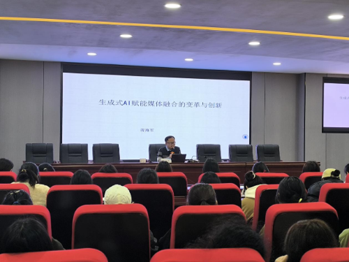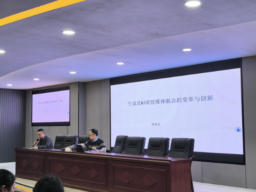2月28日下午,贵州黔南科技学院文学与新闻传播学院当代传媒前沿系列讲座主题2024-2025第二学期第一期在感恩楼308新闻发言人实验室开讲。由复旦大学新闻学院博士后,现任贵州日报报刊社记者、媒体融合发展研究部副主任、《媒体融合新观察》副总编辑蒋海军担任主讲专家。以《生成式AI赋能媒体融合的变革与创新》为主题,带来前沿洞见共同探讨数字时代的发展趋势与影响。讲座由学院党委副书记、院长张多朋主持。