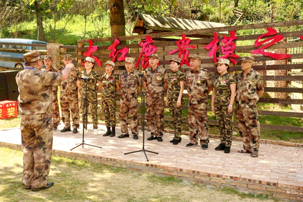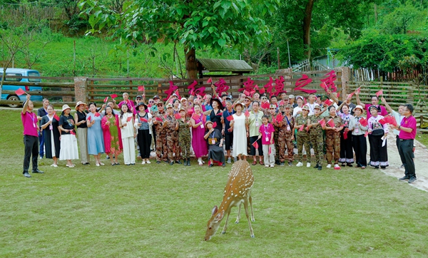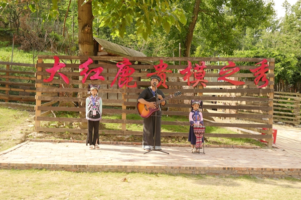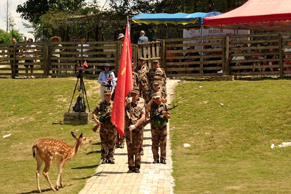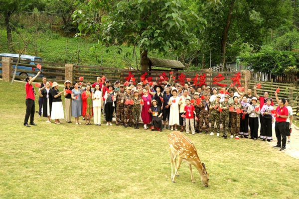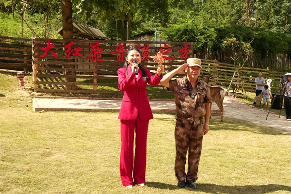 | 贵定8月2日电 青山为幕,鹿鸣为伴。在中国人民解放军建军98周年之际,一场别开生面的“向军人致敬”实景秀联欢会在贵定县昌明镇格鲁格桑贵州民俗大观园大红鹿公园深情上演。活动以“拥军爱国心,军民鱼水情”为主题,将多彩的民族时尚、灵动的自然生态与深沉的拥军情怀完美交融,为南部战区50余名退役老兵及700余名军人军属献上了一场饱含敬意的视听盛宴,绘就了一幅军民同心、鱼水情深的时代画卷。 荣光启幕:致敬与铭记 蓝天绿草间,数十只温顺的梅花鹿悠然漫步,成为这场致敬盛典最灵动的背景。联欢会在激昂的军乐与《英雄儿女》的壮美舞姿中拉开序幕,瞬间点燃全场激情。 “战旗猎猎,军魂巍巍!我们以青山为幕,以拥军的赤诚为灯,致敬最可爱的人!”主持人的开场白道出全场心声。贵州省政协原副主席班程农等领导嘉宾莅临现场,与军人军属代表共聚一堂。大红鹿品牌创始人刘智远与活动总导演、知名音乐文学创作人张超先后致辞,强调活动旨在依托“旅游+演艺+非遗”的创新模式,弘扬拥军传统,擦亮贵州民族时尚文化名片,打造“演艺+”融合标杆。 随后,退役军人代表铿锵有力的发言引发共鸣。“今天的安宁,是无数战友用青春与热血铸就的丰碑!”,饱含深情的军人誓言令人动容。领导嘉宾的节日祝福,更传递出全社会对军人职业的尊崇与对军属奉献的深切关怀。 铁血丹心与情深意长:艺术礼赞军民情 整场演出紧扣军魂传承与军民同心两大主线,节目编排匠心独具: