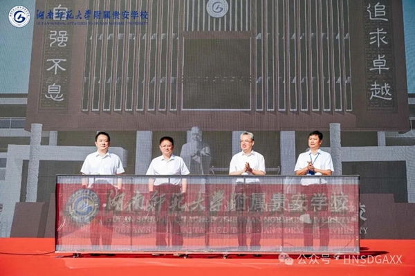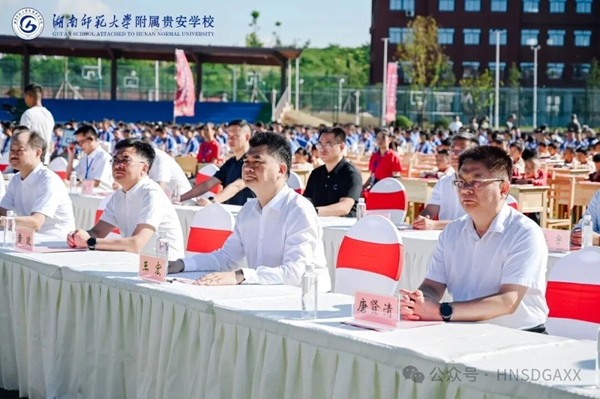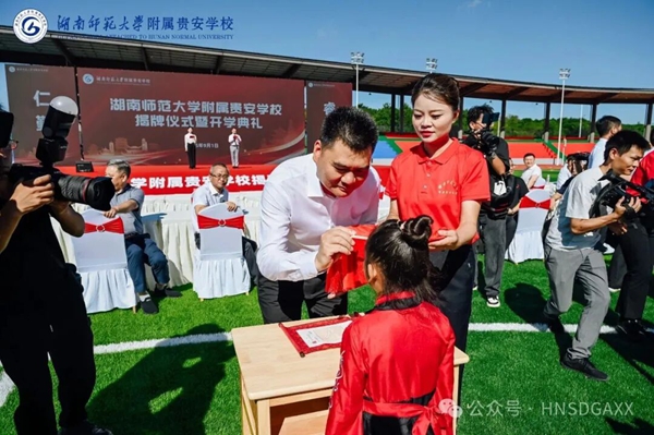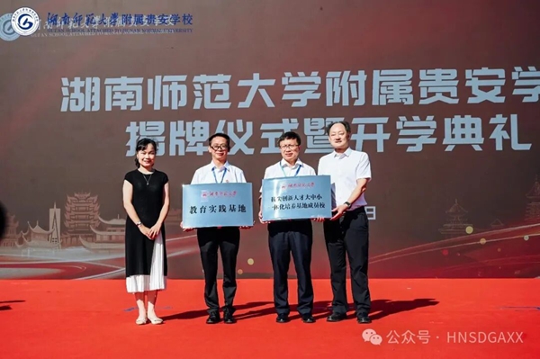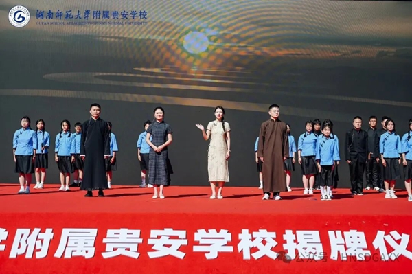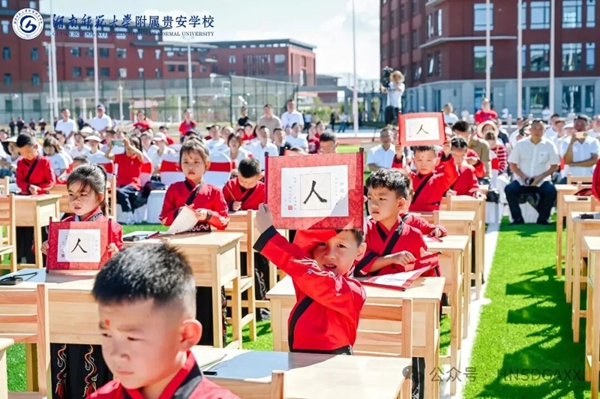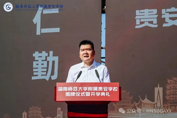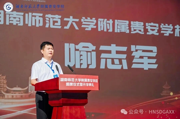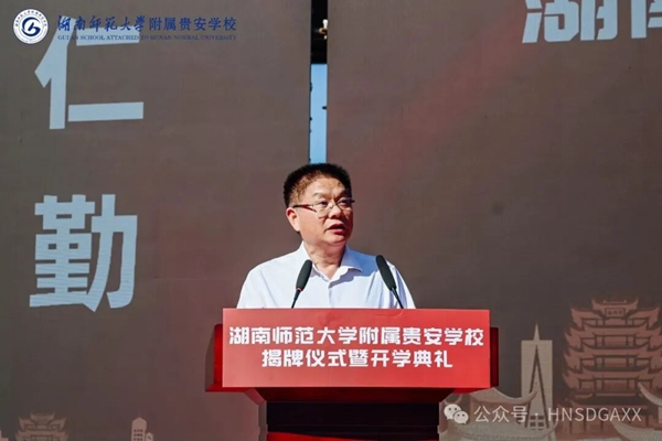 金风送爽,硕果盈枝。2025年9月1日,在贵安新区这片充满生机与希望的热土上,湖南师范大学附属贵安学校揭牌仪式暨开学典礼盛大启幕。这一重要时刻,不仅标志着湘黔两地教育协作结出丰硕成果,更意味着一所承载两地教育的十二年一贯制公办学校正式扬帆,为区域教育高质量发展注入全新动能。 一、国旗飘扬,双歌共振:一场跨越山海的教育对话 贵阳市委副书记、市长、贵安新区党工委副书记、管委会主任王宏,湖南师范大学党委委员、副校长唐贤清,贵阳市委副书记黄波,贵阳市委常委、贵安新区党工委副书记、管委会副主任(兼)王嶒,湖南师范大学基础教育发展中心主任蔡炳华,基础教育发展中心副主任刘晓燕,湖南师范大学附属中学党委委员、副校长李智敏,基础教育发展中心项目部部长李东权出席活动。与此同时,现场还汇聚了贵阳贵安相关部门领导和嘉宾,以及800余名师生和家长代表共同见证这一重要时刻。 国歌余韵未散,激昂的湖南师大校歌紧随响起,双歌共鸣间,湘黔两地的教育情谊跨越山海、紧密相连。随后,湖南师范大学附属贵安学校首任校长喻志军发表重要讲话,强调学校将秉承湖湘教育传统,以“仁勤睿行”为校训,以“以人为本,奠基未来”为办学理念,致力于培养兼具家国情怀与创新能力的未来人才。学校依托湖南师大附中成熟的课程体系与师资培养模式,结合贵安新区发展需要,打造具有“山水灵性、智慧光芒、生命气象”的未来学校,着力营造“博学贵品,修己安人”的优良校风。同时,对学生提出“笃志、善思、敏行、求是”的成长要求,希望他们在习惯、人格、能力三个方面全面提升;对教师则倡导“锐进、融合、精业、垂范”的教风,强调以专业与爱心助力学生成长。未来,学校将立足贵安、辐射西南,构建多元人本课程体系,致力成为区域基础教育的新标杆。 二、揭牌授牌,使命在肩:湘黔教育协作的“金字招牌” 在全场嘉宾与师生的共同见证下,典礼迎来核心环节——揭牌与授牌仪式。王嶒副书记、唐贤清副校长、李智敏副校长、喻志军校长携手按下启动键,“湖南师范大学附属贵安学校”校牌正式亮相,金色校名在阳光下熠熠生辉,现场掌声雷动,经久不息。 蔡炳华主任、刘晓燕副主任分别向附属贵安学校授予“湖南师范大学教育实践基地”“湖南师范大学拔尖创新人才大中小一体化培养基地成员校”铭牌。这两块沉甸甸的铭牌,不仅是荣誉的象征,更赋予学校重要使命:从诞生之初,便要肩负起探索教育创新路径、培育拔尖人才的重任,成为湘黔教育协作的“金字招牌”。 三、领导致辞,寄语未来:教育新程的殷殷期待 唐贤清副校长在致辞中指出,贵安新区作为国家级新区,正以“一年一个样、三年大变样”的奋进姿态,书写高质量发展的时代篇章。附属贵安学校的落地,既是贯彻贵州省“教育优先发展”战略的关键举措,也是校地携手、共育英才的重要里程碑。他强调,学校将充分依托湖南师范大学的学科优势,传承附属中学“金牌摇篮”的办学经验,构建“小初高一体化”现代化教育体系,深化“课程共建、师资共培、资源共享”办学模式,以体制机制创新释放发展活力,让先进教育理念在黔中大地落地生根、开花结果。 王宏市长同样送上殷切寄语。他表示,依托湖南师范大学优质基础教育资源与先进管理体系,加之全体师生的共同拼搏,附属贵安学校必将建成现代化、智能化、生态化的新型教育空间,成长为一所高质量、有特色、人民满意的标杆学校,为贵安新区乃至全省教育事业发展贡献重要力量。