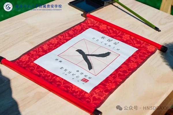 四、文脉相传,仪式育人: 传统文化与现代教育的完美融合 典礼现场,文脉流淌,尽显传统文化与现代教育的深度融合。学校师生代表演绎诗歌朗诵《师者大道》,朗诵者以饱满的情感、铿锵的语调,将湖湘文化的深厚底蕴与贵州大地的蓬勃生机融为一体,生动诠释了“立德树人”的教育初心,赢得全场阵阵喝彩。 小学一年级新生的“开笔礼”更是仪式的亮点。领导与嘉宾手持朱砂,为孩子们“点痣启智”——一点朱砂落眉间,寓意开启智慧之眼,从此迈开探索知识的第一步。这一传承千年的传统礼仪,与现代教育“培根铸魂”的理念相得益彰,展现出学校“在传承中创新、在创新中育人”的办学思路。 最动人的瞬间,当属“破蒙写人”环节。在主持人的引导下,孩子们手握毛笔,一笔一画认真写下人生中的第一个“人”字。落笔之后,全体新生齐声高呼:“堂堂正正中国人!”稚嫩的声音里满是坚定,叩击着在场每个人的心灵,生动诠释了学校“为党育人、为国育才”的使命担当。