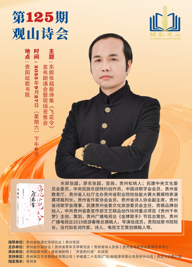 | 秋意渐浓,诗意正浓。9月27日下午,第125期观山诗会——东郎张超新诗集《飞花令》发布朗诵会暨签售会在充满人文气息的贵阳絃歌书院成功举办。本次发布会由贵州省朗诵文学研究会、贵州学派指导,贵州省作家协会、贵州省青年文学研究会、贵州省诗人协会、贵州省诗歌学会朗诵艺术中心主办,贵阳絃歌书院、盛世湘黔网、“声音的行者”乐读团承办,贵州新汉方生物技术有限公司、中城建二十五局(广东)新能源有限公司贵州分公司、贵定大红鹿公园、贵州泉等单位支持。社会各界领导、嘉宾及诗歌爱好者齐聚一堂,共同见证了这一文学活动。 发布会伊始,主持人以“最是书香能致远,腹有诗书气自华”为引,表达了对与会者的热烈欢迎。活动在隆重而温馨的氛围中正式拉开帷幕。诗集作者、知名音乐文学创作人东郎张超首先登台致辞,分享了他的创作心得与心路历程。他表示,诗歌是向万物的问候,致力于用文字传递美好。作为其第七本诗集,《飞花令》精心收录了近年力作,全书分为“诗酒趁年华”“当时只道是寻常”“天涯共此时”三个篇章,展现了诗人丰沛的情感和对生活深邃的洞察。 随后,与会领导专家、主办单位、出品单位及支持单位代表相继致辞,对东郎张超在文学创作上的持续耕耘表示赞赏,并肯定了此次活动对推动本土文学发展的积极意义。贵州师范大学文学院副院长、贵州省作家协会副主席李俊教授等专家也从文学角度出发,阐述了《飞花令》的艺术价值与文化内涵。 当天活动的高潮是新书揭幕仪式。在热烈的掌声中,东郎张超与嘉宾共同为覆盖红绸的新书揭幕,标志着《飞花令》正式与读者见面。紧随其后的诗歌朗诵环节,来自贵州省诗歌学会朗诵艺术中心和其它相关组织的朗诵者深情演绎了诗集中的作品,如《花落知多少》、《诗语》、《书香年华》、《花语》、 《你好!童年!》、《父亲》、《肿瘤医院病房外的那棵树》、《诗赞祖国》等多首作品。此外,歌手还现场演唱了东郎张超作词的歌曲《云上贵州》、《怜君心》等;声情并茂的表演将现场观众带入到家了一个温暖而深邃的诗意世界,充分展现了诗歌的感染力。 活动最后进入签售环节,东郎张超为热情的读者签名留念,现场交流气氛热烈。本次发布朗诵会不仅是一场新书的推介,更是一次诗意的汇聚与文化的传承,为贵阳的秋日增添了一抹隽永的文学色彩。 一审:刘银 二审:杨雪 三审:肖静 |