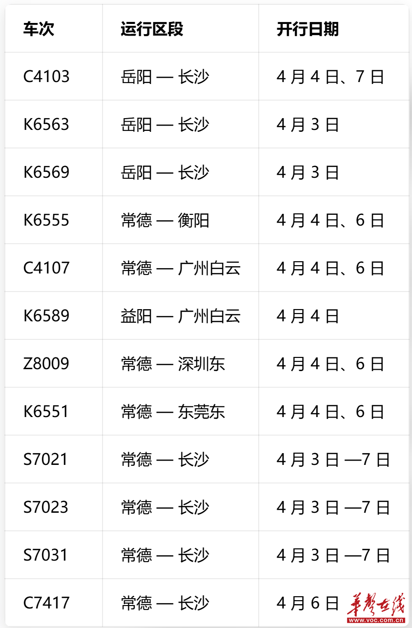 | 2026年清明假期临近,踏青出游、短途旅行、探亲访友与学生往返客流叠加,铁路即将迎来出行高峰。30日,记者从广铁集团长沙车务段获悉,为全力保障旅客出行需求,4月3日至8日,岳阳、常德、益阳站将增开12趟始发临时旅客列车。 (岳阳、常德、益阳站增开列车情况。 通讯员供图) 据统计,长沙车务段管内各客运站清明假期预计发送旅客20.7万人次,其中4月6日将迎来客流单日最高峰,预计发送旅客6.5万人次。 针对小长假期间可能出现的降雨天气,长沙车务段已对管内常德、岳阳、益阳、益阳南、衡山、汨罗、汉寿等13个客运站提前部署、周密安排,全力守护旅客出行安全。 客流高峰时段,各车站将增开售票窗口、延长售票服务时间,加强进站、安检、出站等关键岗位人员配置,并根据重点列车、始发列车运行情况灵活调整检票时间,强化站台乘降组织,确保旅客进站有序、乘车安全顺畅。 |