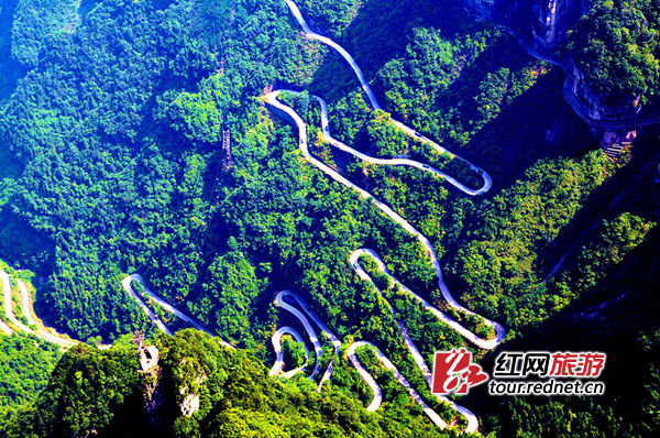 (阳光照在行驶在山间的车上,车辆活像几只发亮的甲虫。) (公路就像盘在山间的巨蛇。本文组图为稀里马哈 摄) (从空中俯瞰,蔚为壮观。) 红网张家界8月29日讯(时刻新闻记者 姚冶 摄影 稀里马哈)今日,时刻新闻记者在张家界拍到“扭曲到极致”的天门山盘山公路。从空中往下俯瞰,公路如蛇一般盘在山间,险峻无比,令人窒息。