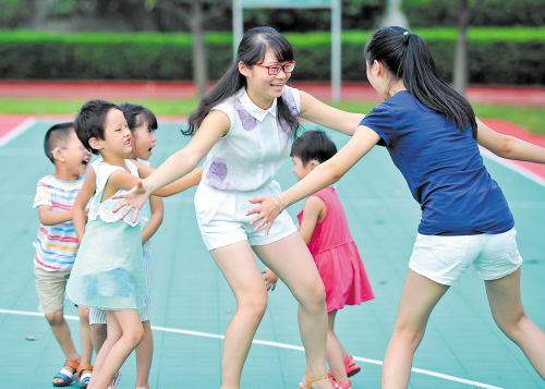 浏阳市特殊教育学校操场内,熊利娟老师(中)带着学生们玩起了“老鹰捉小鸡”的游戏。