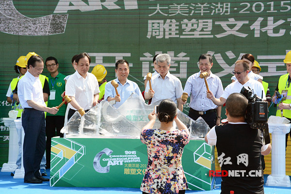 出席领导分别手持小金锤,凿向洋湖之水凝结成雕塑艺术节主题LOGO的巨型冰砖,寓意雕塑文化艺术节正式破冰启动。