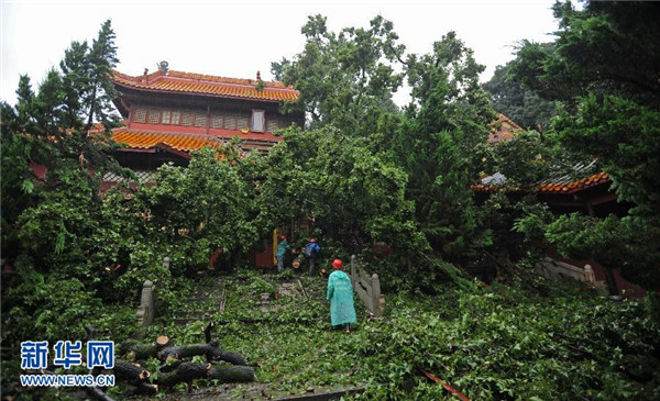8月18日,工作人员正在清理压垮岳麓书院大成殿的古树树枝。 新华社记者 李尕 摄