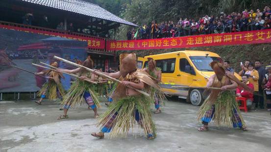 (长塘瑶族乡老艾坪村自然风光旖旎,保持原生态。) 洞口县长塘瑶族乡老艾坪村地处雪峰山腹地,距洞口县城仅20公里,是长塘瑶族乡瑶族人口居住最为集中的地方,平均海拔在1000米以上。这里是国家级非物质世界文化遗产——棕包脑舞的发源地;有极具特色瑶族文化——瑶歌、瑶语、盘王节和狩猎文化;有反映瑶族宗教特色的梅山五祖庙、天门公主庙;有抗日战争遗址芷江机场瞭望塔和雪峰山战役战场遗址;更有古树参天、流水潺潺、云海茫茫、层峦叠嶂等自然景观。 (国家级非物质文化遗产“棕包脑”舞表演。) (每逢过节,这里的瑶族都要相聚吃长龙宴,体现他们团结友爱。)