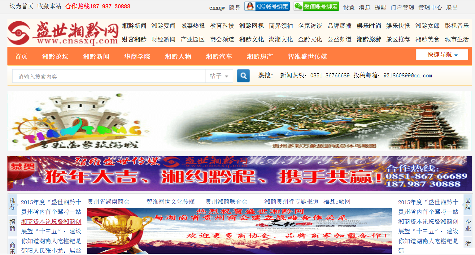 (盛世湘黔网讯 本网记者:湘黔君)2016年1月10日,在贵州湘商联合会2016迎春联谊会上,贵州智维盛世传媒总经理、盛世湘黔网总编辑罗文骅在会上发布了“盛世湘黔·2015年度湘黔网事”评选结果,湖南省贵州商会成立、沪昆高铁贵阳长沙段开通、湘黔签署湘黔高铁经济带合作协议等入选“2015首届年度湘黔十大影响力新闻事件”,贵州湘企三都物资购销中心开工、龙里东方宏基电商产业园启动等荣获贵州湘商十大商业新闻”。发布会由贵州湘商联合会执行会长、省政协委员肖升干主持,原贵州省委常委、常务副省长袁荣贵、原贵州省委宣传部副部长卜茂生、贵州省人民政府参事、省委政策研究室正厅级干部吴祖平、原贵州省民委常务副主任杨东胜、贵州省社科院原院长蒋南华等有关领导和贵州湘商联合会会长黄建军等近200名湘商莅临现场。 据悉,入选“2015年度盛世湘黔十大新闻事件”的分别是:1、湖南省贵州商会成立,2、沪昆高铁贵阳长沙段开通,3、“诚信赢天下”全球湘商巡回签名活动走进贵州 4、湘黔鄂三省“土司文化”联合打包申报世界文化遗产成功 5、湘黔两省领导在怀化签署建设湘黔高铁经济带合作框架协议 6、2014中国湘商力量总评榜在长沙举行,贵州湘商荣获殊荣 7、贵州湘商联合会换届成功,黄建军当选会长 8、贵州省湖南商会换届成功,刘东旺续任会长 9、第七届湘商大会在邵阳举行,湘黔各大商会代表参加 10、贵州省领导考察湖南文化产业,倡导湘黔打造湘黔文化圈。 入选“2015年度贵州湘商十大商业新闻”分别是:1、投资11.6亿元的贵州湘企三都物资购销中心开工 2、贵州湘源国际五交化机电城获得“2014中国湘商十大最具投资价值经济园区(市场)”3、贵州中财福鑫获得“2014中国湘商十大诚信企业”。 4、龙里东方宏基电商产业园“尾货”电商产业园运营 5、凯里佳和盛世蝴蝶谷文化广场启动,寻找最美香妃活动备受关注 6、贵州乔海富邦通用航空公司成立,贵州湘商进军民航产业 7、弘宇琉森堡荣获2015楼盘性价比测评榜贵阳高端楼盘五强、最佳户型榜10强。8、今童孕婴与恒大乳业集团签订战略合作,赵胜祥荣获中国孕婴童产业“终身成就奖” 9、凯威国际创客中心揭牌,贵州湘商搭建青年双创平台 10、黔中国际商贸博览城招商会落幕书写织金新商业华章 据悉,“盛世湘黔·年度湘黔网事暨品牌人物”评选活动是由湘黔两省战略合作与交流综合资讯互动门户《盛世湘黔网》发起主办,贵州湘商联合会、贵州省湖南商会、湖南省贵州商会协作,由贵州智维盛世传媒策划执行,湘黔有关领导专家资深传媒人士参与的年度品牌评选活动。旨在弘扬社会主义核心价值观,营造健康向上的社会风尚,追踪湘黔两省战略合作与交流互动重大动态和财富商机、传播社会文明,通过网络媒体的优势以及新型媒体强大的互动性和传播性,倡导积极向上的社会文明,营造良好的舆论氛围,助推湘黔品牌成长,促进湘黔两省经济繁荣。 据了解,《盛世湘黔网》是在湘黔有关政府部门、贵州湘商联合会、贵州省湖南商会的支持下,由文化湘军在黔智业先锋机构——贵州智维盛世文化传媒发展有限公司运营,专门服务于湘黔两省战略合作与交流的大型综合资讯互动门户,自2014年9月份在全球精英湘商贵州行大型活动期间上线,秉承“弘扬湖湘文化、网聚湘黔精英、传播湘黔品牌、助推湘黔发展”的宗旨,经过一年的运行,积极跟踪报道湘黔互动资讯,传播湘黔品牌文化,搭建起网络信息直通车,目前已经拥有注册会员70000多名,由该网站发起主办,联合有关商协会协办的,发起主办的“盛世湘黔·年度湘黔网事暨品牌人物”评选活动将打造成一年一度的湘黔网络品牌文化盛会,将在每年年底评选,第二年初发布,梳理过去一年的湘黔网事和湘商贵商发展新常态,促进湘黔民间文化交流和品牌文化建设与传播,本次作为首届评选只评选事件,不含品牌人物评选,只针对湘黔互动有关,与湘黔发展切身相关,具有一定影响力的新闻事件进行评选。 获得“2015年度湘黔十大影响力新闻事件”: 1、湖南省贵州商会成立,三湘贵人抱团发展。 2015 年6月8日,由贵州省旅游局、贵州省投资促进局、湖南省贵州商会主办的“2015让湖南发现贵州——湖南省贵州商会成立庆典、贵州旅游招商推介会暨高铁时代贵州旅游发展高峰论坛“大会在长沙华雅国际大酒店隆重召开,窦晓琨当选会长、杨静当选秘书长。在三湘大地创业发展的贵州籍商人凝聚成团,抱团发展,组建成了以湖南省科佳投资管理有限公司董事长窦晓昆领军的一支商海舰队,众多在湖南创业的贵州商人在第二故乡有了共同的“家”。2、 沪昆高铁贵阳长沙段开通,助推湘黔战略合作。 6 月18日,开往长沙南的首次列车缓缓驶出贵阳北站,标志着沪昆高铁贵州东段正式开通。这是继贵广高铁后的又一条重要线路,打开了贵州通往全国主要城市的快速通道,加快速度融入到全国高铁网,缩短了贵州与京津冀、长三角、泛珠三角等地区的时空距离。盛世湘黔网总编罗文骅应邀作为在黔发展湖南人体验嘉宾乘坐第一趟高铁赴长沙,与湖南省贵州商会秘书长杨静签署了“迎高铁 助湘贵”盛世湘黔网与湖南省贵州商会战略合作协议,贵阳电视台全程跟踪报道,贵州卫视新闻联播、贵州交通广播等媒体报道。3、“诚信赢天下”全球湘商巡回签