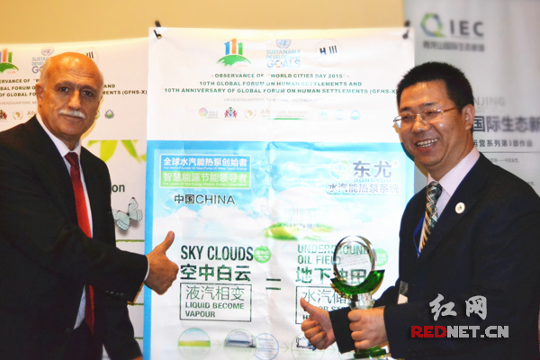 联合国环境规划署可持续消费与生产部部长阿拉布•霍巴拉为黄国和颁发了“全球人居环境绿色技术范例”奖。 时刻新闻记者 易添麒 刘怡斌 通讯员 余旭华 长沙报道
