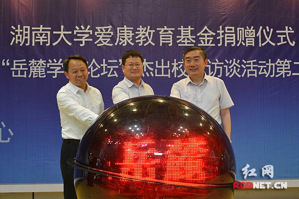 湖南大学与爱康集团总裁邹承慧(前排左)签订捐赠协议。 湖南大学党委书记蒋昌忠(右)、校长段献忠(左)与校友邹承慧(中)共同启动校庆众筹捐赠平台。