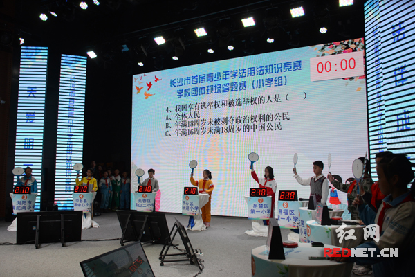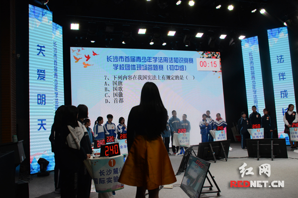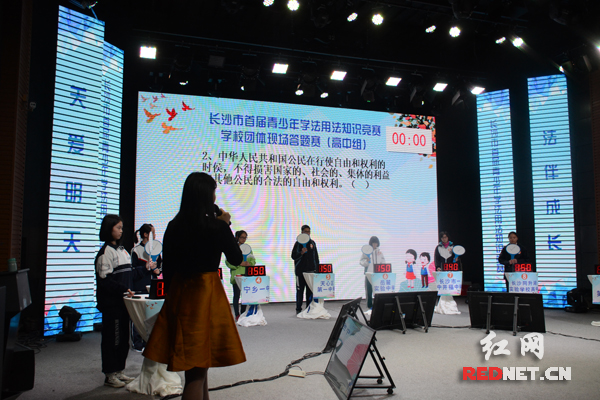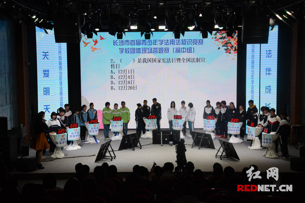 11月27日,长沙市首届青少年学法用法知识竞赛学校团体现场答题赛在红网演播中心举行。 小学组比赛现场。 初中组比赛现场。 高中组比赛现场。 风险题环节上,比赛选手因答对题目掩不住内心高兴。 红网长沙11月27日讯(时刻新闻记者 肖懿)长沙市首届青少年学法用法知识竞赛学校团体现场答题赛今天在红网演播中心举行,入围现场答题的代表队按照小学组、初中组、高中组分别进行比赛,充分展示了长沙广大中小学校的法治校园创建成果。 在活动组委会的精心组织下,长沙市首届青少年学法用法知识竞赛模范学校评选吸引了全市近2000所中小学校参与到竞赛活动中来,经过资格申报、网上学法、区县评定等环节,现已有小学(11所学校)、初中(11所学校)、高中(10所学校)代表队入围现场答题赛环节。 为了保证竞赛活动的公平公正,本次学校团体现场答题赛由湖南商学院法学院及湖南省教育法治研究中心统一命题,并现场公证。 比赛分为必答题、抢答题、风险题以及加赛题四个环节,题目难易比例适中,涉及范围广泛。各学校代表队在必答题环节得分差距不大,抢答题逐渐拉开差距,在风险题环节上,由于答对加分答错扣分使得比赛充满了悬念。 最终,小学组获得前五名的代表队分别为:开福区第一小学、岳麓区第一小学、长沙市实验小学、雨花区育新小学、望城区高塘岭实验小学; 初中组获得前五名的代表队分别为:明德麓谷学校、长沙市长郡芙蓉实验中学、长沙麓山国际实验学校、湖南师大附中星城中学、长沙县星沙中学; 高中组获得前五名的代表队分别为:望城区第一中学、长郡梅溪湖中学、长沙县实验中学、岳麓实验中学、长沙同升湖实验学校高中。 此次竞赛由长沙市委法治办、市教育局、市司法局、市文明办联合主办,红网承办。旨在认真落实全面推进依法治国和加强青少年法治教育的工作要求,全面提升青少年学生的法律意识和法律素养,充分展示长沙市广大中小学校的法治校园创建成果,在学校、家庭、社会之中营造青少年尊法、学法、守法、用法的浓厚氛围,促进法治长沙、文明长沙建设。 |