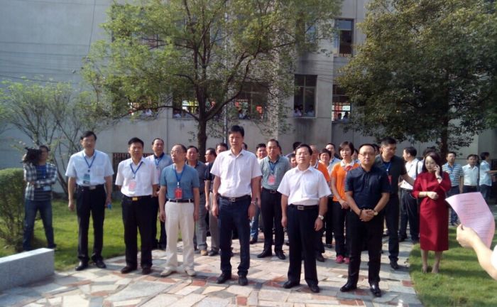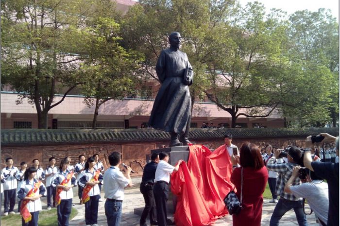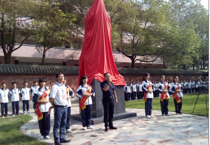 (隆回县委书记赵湘明、县长马建强和欧阳毅一起为魏源铜像揭幕。) (盛世湘黔网讯 记者:李芳)十月三日上午九时八分,魏源铜像揭幕仪式在湖南省级示范重点中学邵阳市隆回县第二中学隆重举行,隆回县四大家领导全部和众多校友参加了揭幕仪式,这是该校90周年校庆纪念活动的重要一环,校园里又增添了一道重要的人文景观。  据悉,隆回二中位于隆回县城桃花坪镇近郊320国道旁,前临碧波荡漾的赧水河,后倚郁郁葱葱的老虎山,交通便利,环境优雅。校园占地380余亩,建筑面积近10万平方米,学校2002年跨入湖南省重点中学行列。现有教学班级77个,学生近5000名,教职员工296名,隆回二中以严明的校风、严谨的学风和显著的办学成果享誉三湘。近年来,该校把家乡先哲、中国睁眼看世界第一人魏源的思想文化注入学校发展的灵魂,以魏源思想引领学校走向新的征途。这里不仅有国内闻名的“全国十佳中学文学社“默深文学社,还构筑默深墙,开辟默深园,建立默深亭,矗立默深像,拓修默深路,打造默深文化广场。80届部分校友捐资建设50多米的魏源文化墙长廊,92届校友丁群捐款40万元立彩色多功能电子显示屏,93届校友王江田捐资40万元修建办公楼前128米长的汉白玉栏杆,87届校友邹今友捐资10万元购来景观石,高144班校友捐资40万元修建科教楼后汉白玉栏杆及完善道路设施,在该校90周年校庆之际,初72班校友欧阳毅、袁广见以72班名义出资修建40余万雕塑魏源铜像。揭幕之前,欧阳毅代表初中72班致辞,他表示:家乡先哲魏源的《海国图志》和“师夷长技以制夷”的思想曾经闻名海内外,是中国近代思想启蒙先驱,希望学校学子继承弘扬魏源“经世致用、变革图强”的先进思想文化理念,努力学习上进,成为社会有用之材。县委副书记陈历贤主持揭幕仪式。