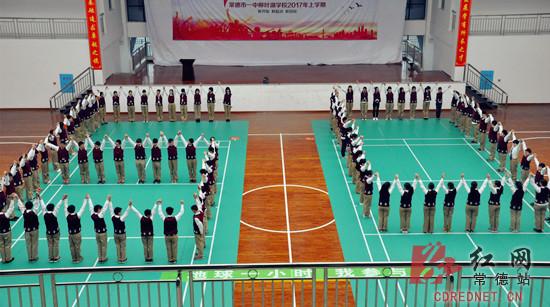 湖南省常德市一中柳叶湖学校的同学摆出“地球一小时”60分钟的造型。