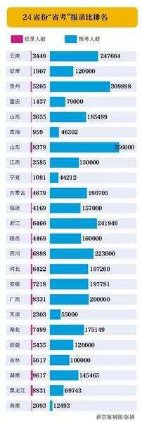 ![]() ![]() ![]() 昨日,全国24个省份同时举行公务员招录“省考”,省、市、县、乡四级公务员岗位密集向社会招录“新官”。据各省公开发布的招生公告显示,这次24个省份共招录公务员119694名,报名参加考试的人数超过378万人。 招 录报名人数显示,湖南省招录人数最多,为9617人;而山东省招录8379人,报名人数则为各省最多,有35.6万人报名。在具体的招录职位方面,竞争最 为激烈的浙江宁波江北区一“人才开发”职位,招录1人,报考人数达1746人。不过,在各省的报名人数中,也有上百个职位无人报考,基层法院“法官助理” 等职位“零报考”现象突出。 昨日举行的笔试分为行政能力测试和申论两部分,从已公开的相关考题看,“共享单车”“冬奥会”等一些时政、社会和经济方面的热点话题进入考题。也有多省试题中出现古代诗词方面的内容,专家表示,“省考”对考察公务员的综合素质的要求有所提高。 看点1 平均72人竞争1职位云南省考竞争最激烈 与 中央国家机关及直属机构公务员考试的“国考”相比,昨日24个省份举行的公务员“省考”招录的是省、市、县、乡四级的公务员职位。2017年公务员“省 考”招录工作从去年11月开始陆续启动,北京、上海已于去年底进行了笔试,而江苏、广东两省的笔试也于今年3月11日和4月8日分别举行。 昨日举行公务员招录“省考”笔试的24个省份分别为吉林、黑龙江、浙江、贵州、福建、云南、湖南、甘肃、江西、广西、海南、新疆、天津、山东、山西、四川、内蒙古、安徽、湖北、宁夏、重庆、河北、陕西、青海。 从招录规模看,24个省总共招录的人数为119694人,而截至笔试前期,各省系统报名并通过审核的人数达到了378.4万人,平均31.6人竞争1个职位。有12个省份招录人数都超过了5000人。 招录规模最大的湖南省、黑龙江省和山东省今年分别招录9617人、8831人、8379人。今年许多省份招录公务员都较去年有所增加,黑龙江今年招录公务员较去年增加2687人,增幅达43.7%。 据北京华图教育相关统计,报名人数最多的前三省分别为山东、贵州和云南,其中山东省的报名人数达到35.6万人。从报考人数和招录人数的比值看,云南省平均1个职位有72人报考,竞争最为激烈。 看点2 最热职位1746人抢多地法官助理无人报考 在各省招录的职位中,发改、地税、卫计等部门受到考生追捧,多数职位成为热门职位。如云南昆明市卫计委一职位招录1人,有1066人报考。最热门的要数浙江宁波市江北区人才市场管理办公室“人才开发”职位,1746人争抢这1个职位。 除了一些热门职位外,一些省份也出现了大量职位无人报考或报考人数未达到开考比例的情况。如内蒙古今年计划招录4679人,但报名结束后,因部分职位未达到开考比例而被取消或减少200个录用数,实际开考时招录的人数为4479人。 记者注意到,一些基层司法机关设置的法官助理、检察官助理这一类职位频现“零报考”现象。除一些基层法院如广西田林县、河北博野县法院外,甚至连珠海市中院、黑龙江省法院系统招录的职位也出现了“零报考”。 国家公务员局相关专家介绍,冷门的职位相对集中在艰苦、边远的地区,或是对专业要求较高的职位。一些基层岗位,也确实存在着招人难的现象。 “我们近年来出台了许多支持基层公务员的政策,鼓励到基层岗位建功立业。”这位专家介绍,目前到艰苦边远地区或国家扶贫开发工作重点县等地区机关事业单位工作的大中专毕业生,会定高级别工资或薪级工资,未来公务员的涨薪也将明确倾向基层公务员。 此外,24省份发布的职位中,每个省份都有警察招录计划,记者注意到,一些省份的警察招录规模还比较庞大。如黑龙江此次公务员总共招录8831人,而公安系统招录的人数就达到2100人,占比接近1/4。云南、福建招录警察也达到524人和433人。 看点3 多省现古诗词考题考生吐槽“难度不小” 中公教育公务员考试相关专家介绍,今年的行政能力测试紧扣社会经济的热点话题,一些省份的考题考察了第31届夏季奥运会和第24届冬季奥运会的举办城市。在法律知识方面,各省试题也有涉及刑法、侵权责任、行政诉讼等方面的考题。 在吉林省的考卷中,一辆选词填空题谈到了共享单车,其中说道“我们年轻时说好了‘要做共产主义接班人’,五六十年过去了,连个共享单车都不能容,眼看着单车一方面泛滥成灾,另一方面又共享不成”。 在一些省份的考卷中出现了古代诗词的考题,要求考生从8句古诗词里选出属于“触景生情”的诗句,有考生吐槽:难度还不算小。 “习近平总书记在讲话中就经常用典。从事行政管理或社会经济工作,需要一定的文化素养。”国家行政学院教授竹立家表示,对诗词的了解和理解,不光是对古文能力的考察,诗词里包含的道德和审美情趣的理解,是公务员应该培养的素质。 今 年的申论考题,话题都围绕当下最新的问题和发展理念展开。各省考试的话题涉及网络文明、特色小镇建设、权力监督等,要求考生依据材料作文。其中,黑龙江的 一道申论题涉及了权力监督,要求结合材料讨论社会监督员的作用和问题,并落脚到“以人民的名义监督权力”的话题上进行申论作文。 |