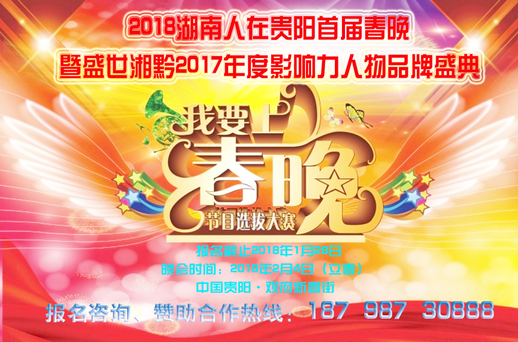 盛世湘黔,湘人筑梦,百万湘人筑梦贵州贵阳,敢为人先,奋发勇为,展示出湖南人的风采,为湘黔两省经济文化发展做出了突出贡献。一年一度的新春佳节,是中国人民重要的传统节日。回家过年,是每一个异乡人最美好的期盼,对于每一个异乡游子来说,能欢聚一堂共迎新春也是一种期盼。 为贯彻落实“文化强国”和“湘黔两省战略合作框架协议”战略,活跃在黔百万湘人迎春气氛,晚会将以“湘约贵人·湘商筑梦”为主题,围绕宣传贯彻党的十九大精神,以人民对美好生活的向往为中心,以在黔湘商企业文化为基础,传承中华优秀民族文化,弘扬湖湘文化,展示贵州湘商风采和湘黔社会正能量,为在黔百万湘人奉上一年一度欢乐祥和的迎春文化盛宴,营造湘黔一家亲,贵州湖南人大团结的节日气氛。 由湘黔两省战略合作交流门户《盛世湘黔网》和贵州省网络文化发展协会主办,贵州智维盛世文化传媒策划承办,联合湘黔各大商协会协办,数十家主流网络媒体关注报道的2018首届湖南人在贵阳春节联欢晚会暨盛世湘黔2017年度影响力人物品牌盛典,即将于2018年2月4日在贵阳市观山湖区观府新壹街喜临门宴会广场隆重举行。现面向湘黔两省征集2018湖南人在贵阳春节联欢晚会节目,现就有关事项公告如下: 一、 征选要求1、晚会宗旨:为在黔湘商、湘人提供一个展示企业文化和自我的舞台,为大家提供一个记录创业发展心路历程,充满欢乐、激情的才艺展示大舞台。 2、征集原则:征集节目和演员以“自愿参与、欢乐互动”为原则,提倡奉献赞助精神,以“我要上湖南人在贵阳春晚”为追求,以“我能上春晚”为荣誉,原则上不安排演出经费,只提供纪念品和荣誉、晚宴,商会和湘商可以作为展示商会、企业形象和品牌文化,宣传企业品牌的重要活动,产生费用自理。 二、面向对象: 湖南贵州各大湘籍商会和会员单位、贵州湖南籍企业、湖南贵州籍企业、贵州湖南人,湖南贵州人,贵州湖南籍商会会员单位推选,湘籍高校社团学子、湖南老乡家人亲友。湘黔团体及个人、专业演员及业余演员均可申报。 业余类:演员颁发荣誉证书、推选单位颁发晚会支持匾牌一块,盛世湘黔网和微信公众号《盛世湘黔》提供推选单位专题宣传报道一篇。 专业演员:演员颁发荣誉证,盛世湘黔网和微信公众号《盛世湘黔》提供演员专题宣传报道一篇。并安排不低于5家综合门户网站媒体报道。智维盛世文化传媒公司提供演出经纪包装宣传,长期战略合作,重点推介参与传媒公司公关演艺活动。 知名演员:颁发盛世湘黔网形象大使荣誉证书,安排不低于10家国内知名综合门户网站媒体报道,全年跟踪报道演艺动态和新作,重点推介参与传媒公司公关演艺活动。 三、征选要求: 1、歌曲、舞蹈、杂技、魔术、小品、相声、创意表演等一切适合舞台表演、网络直播呈现的艺术形式。投稿作品需做到导向正确,格调健康,具备一定的艺术水准和创新性。 2、各地州以市、县级湖南商会为单位进行推荐,每个单位所推荐的节目不超过2个(类别不可重复、不包括拜年祝福视频)。 3、各地推选的节目应长度适宜,歌曲类尽量不超过4分钟,舞蹈、戏曲类尽量不超过5分钟,小品、曲艺类尽量不超过8分钟,其他门类和表演形式的节目长度视实际剧情展现需要酌定,但不宜过长。 4、“新年祝福视频”是以各商会或湘商企业为单位,以“新春祝福”和“大拜年”为主题,形式可以活泼多样,人数不受限制,服装要求以新春喜庆为基调,突出热烈祥和的新春气氛。祝福语简洁明了,节奏明快,原则上鼓励使用湖南方言,“祝福”录制完成后,可进行初步剪辑,但不要添加任何视频过度特技和背景音乐及音效,按照要求的统一格式生成视频文件上交春晚节目组即可。 四、提交方式: 1、歌曲以音频文件形式提交,演唱者发送高清照片和个人专业介绍。 2、舞蹈节目、语言节目、杂技节目、魔术节目、绝技绝活和创新类节目以视频文件形式提交。 3、剧本、歌词、创意设想以文案形式提交,祝福贺词以视频。 4、祝贺视频,所有报送内容均需附简要作品阐述及主创人员联络方式。 五、报名途径: 填写资料直接参与或发送至官方邮箱(931860899@qq.com),加微信13765078878申报。截止1月28日, 展示企业文化和才能,秀出最棒自己的时候到了! 从幕后到台前,只一步之遥,用我们的努力,用你们的才艺, 打造2018最精彩、最时尚、最接地气的酷炫春晚! 打造湖南人在贵阳的年度文化盛会我们需要你。 2018湖南人在贵阳春晚组委会暨 盛世湘黔2017年度影响力人物品牌盛典组委会 盛世湘黔网 欢迎湖南企业赞助合作共赢,欢迎湘友参与现场志愿者服务 咨询电话:187 987 30888 137 650 78878(罗文骅) 更多动态关注微信公众号! |