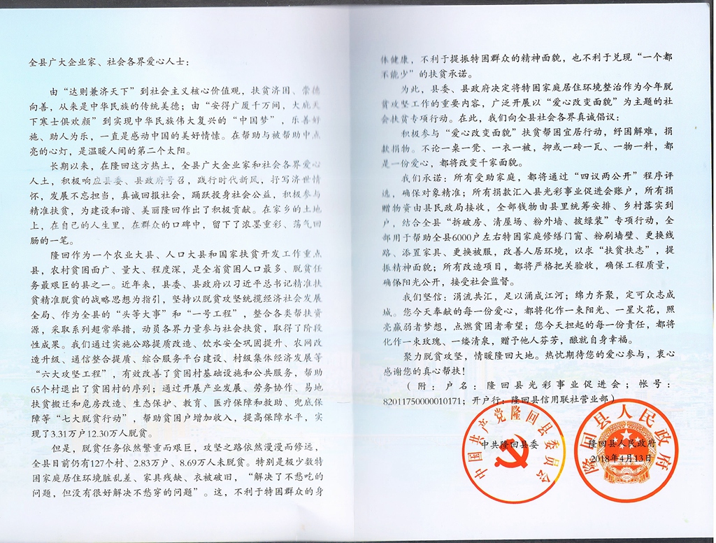 据悉,隆回县委、县政府将特困家庭居住环境整治作为脱贫攻坚工作的重要内容,开展“爱心改变面貌”为主题的社会扶贫专项行动,号召全县各界人士积极参与,踊跃捐款,纾困解难,改变千家面貌。自此项行动开展以来,截止5月9日,全县已有600余家非公企业参加并捐款1437.8237万元,将帮助5720户特困户改善居住条件。其中隆回县罗氏家族有二十余名爱心宗亲纷纷为贫困户伸出援助之手,助力精准脱贫。