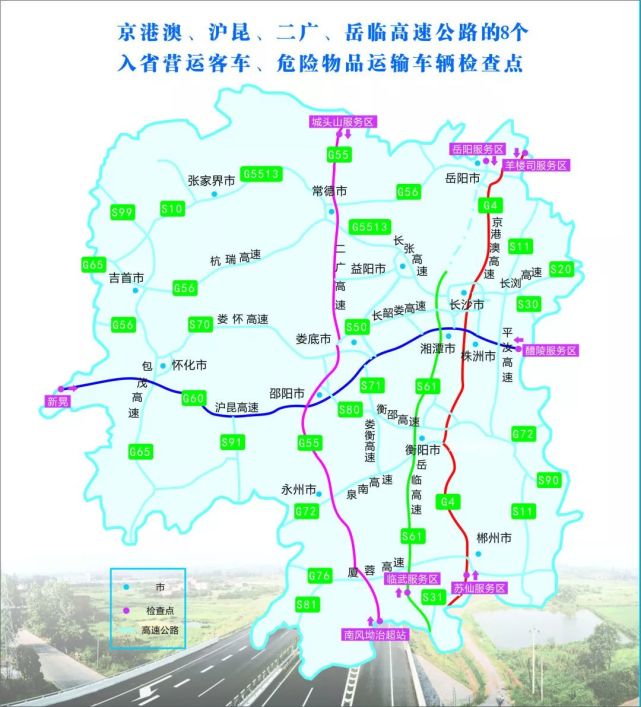 湖南省高警局坚决贯彻落实上级“六个一律”严管举措,全警动员,设立25个入省营运客车、危险物品运输车检查点、10个服务区中途检查点,开展“两客一危”车辆检查登记,严查重点交通违法行为。现将检查点情况公布如下: 京港澳、沪昆、二广、岳临高速公路的8个入省营运客车、危险物品运输车辆检查点实行24小时检查。 其他17个省际入口检查点和10个中途检查点实行6小时检查,检查登记时间为13时至15时、20时至24时。 在规定时间内,客运、危运车辆要按照道路交通标志进入检查点接受检查。违者将依据《中华人民共和国道路交通安全法》和《机动车驾驶证申领和使用规定》予以处罚、记分。 (湖南高速警察) |