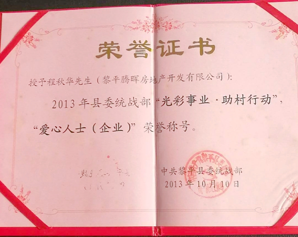 庆祝改革开放40周年贵州湘商十大影响力人物候选: 程秋华 黎平县工商联总商会副会长 黎平县湖南商会常务副会长 黎平县腾辉房地产董事长 贵州华都新型建材有限公司董事长兼总经理 程秋华,男,生于 1970年7月,现任黎平县工商联总商会副会长、湖南商会常务副会长、黎平县腾辉房地产董事长、贵州华都新型建材有限公司董事长兼总经理等职务,为践行社会主义核心价值观,弘扬当地企业家履行责任敢于担当服务社会的精神。2000年-2006年参加乡镇企业建筑公司任项目经理; 2007年至今担任黎平县腾晖房地产公司董事长 2010年至今担任榕江华祥商务酒店、黎平华祥商务宾馆董事长; 2012年至今担任湖南商会常务副会长; 2014年-2017年担任兴黔担保有限公司监事长; 2015年至今担任贵州华都新型建材有限公司董事长,总经理; 2016年至今担任航天医院总经理、贵州大地集团黎平建筑公司副总经理; 2017年至今担任黎平县工商联总商会副会长。 为全县脱贫攻坚汇聚力量,本人积极投身光彩事业和公益慈善事业等社会实践,深入“百企帮百村”精准扶贫行动中,积极参与县社会力量扶贫工作,尽自己最大的努力承担社会责任。 “百企帮百村”精准扶贫行动是民营企业致富思源回报社会,以服务社会为己任,相应党和国家的号召积极投身于脱贫攻坚的洪流之中,勇于担当,敢于奉献。至2007年担任黎平县腾辉房地产公司董事兼总经理以来,年创税收上千万余元。2012年赞助黎平县市政局绿化树3万元,2013年赞助德顺乡张鲁修桥1万元,2014年赞助水口镇修路水泥10吨,2014年敖市镇火灾赞助物资和现金共5000元,2016年以来,九潮镇水灾赞助大米和现金共2万元,赞助牛角湾村修建球场3000元,赞助中潮镇上黄村垃圾桶500元,赞助工商联购办公桌1万元。赞助.对口帮扶地坪乡归白村4万余元,归白小学3000元。同时还购买.4张办公桌,21套桌椅板凳以及电脑一台赠送给归白村。 程秋华名下黎平航天医院已经成为当地具有影响的品牌特色医院,现有医疗业务用房5000平方米,开设病房200张左右,目前使用的医疗设备有DR照片机、16排高速螺旋CT机、核磁共振机、 B超机、心电图机、脑电图机、临床检验项目设备。重点建设科目为医学检验中心、中医康复科、外科。共提供48人的就业岗位,其中贫困户8人,同时为贫困户和退伍军人共17人住院治疗全额报销他们农合未能报销的那部分医疗费用,贵州华都新型建材有限责任公司共提供就业岗位56人,其中贫困户12人,年创税收金额200余万元。先后被授予 “爱心人士”、“诚信企业家”、“优秀企业家”“十大诚信商家”等荣誉称号,同时于2017年9月16日到地坪镇归白村开展的“百企帮百村”精准帮扶行动被发布到了网易头条中。这是对我们民营企业积极参与扶贫工作的肯定,是一种荣誉,更是一种责任,同时也是对我的鞭策,扶贫攻坚工作任重而道远,我作为民营企业人士,更加要积极主动投身于“百企帮百村”精准帮扶工作之中来,不忘党恩,回报社会。 贵州华都新型建材有限公注册资金3000万元,总投资3000万元,年缴税金额200余万元。公司自成立以来,共提供就业岗位56人,其中贫困户12人.2014年赞助德顺乡张鲁修桥1万元,赞助水口镇修路水泥10吨,2014年敖市镇火灾赞助物资和现金共5000元。 2013 年黎平腾晖房地产被县委统战部授予“爱心企业企业”称号;贵州华都新型建材有限公司荣获黎平县2016年度招商引资“优秀企业”称号. 被黎平县精神文明建设指导委员会授予“诚信商家”称号; 被县精神文明建设指导委员会、黎平县工商业联合会(总会)授予“黎平县‘十大诚信商家’”。 2016年九潮镇水灾赞助大米和现金共2万元,赞助雷洞乡培福村小学和慰问贫困户共2万元,2017年赞助工商联办公桌1万元。 2016 年以来,对口帮扶地坪镇归白村共资助归4万余元,归白小学3000元,慰问10户(其中五保户5户,双女户5户)共计5000元。2017年9月16日该公司董事兼总经理程秋华与县工商联第一副主席杨光平、地坪镇人大主席吴龙福等同志到地坪镇归白村开展的“百企帮百村”精准帮扶行动,本次行动共走访慰问群众6户(其中五保户3户,双女户3户),发放慰问金3600元(400元/户),走访慰问结束后在归白小学操场举行了爱心助学捐赠活动,本次活动共捐赠了77套学习用具(包括学前班34人,小学43人),折合人民币3000元。为归白村桥梁建设捐资5000元。同时还为归白村购买4张办公桌,21套桌椅板凳,电脑一台,本次帮扶行动被发布到了网易网中,获得了网民的一致好评。