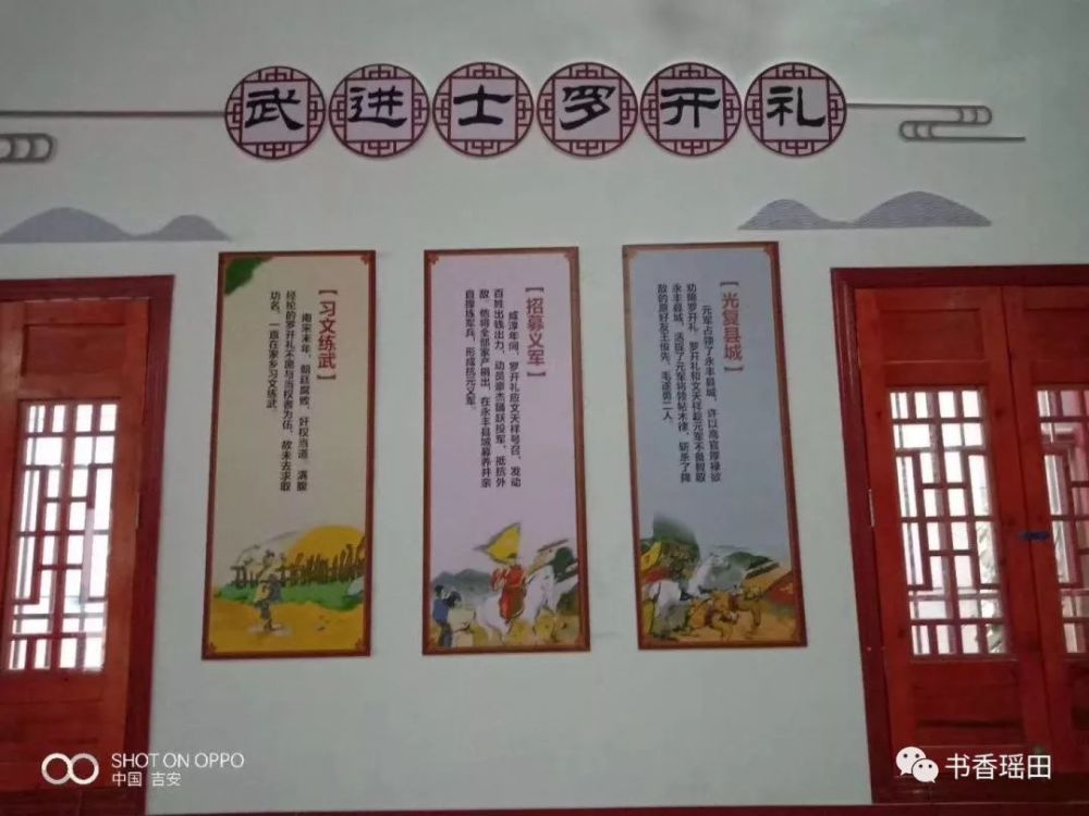 江西省永丰县瑶田镇水心村建于宋代1211年,距今800多年,文化渊远,英才辈出,民风淳朴。2018年,瑶田镇投资近200万元打造崇文水心,突显心字规划人文理念,挖掘古代人文品格,修砌游步道、环村池塘,建有人行桥、文化广场、状元亭。用字画传承先辈的优良品质。全面完成村庄“七改三网”。 排列成“心”型的水系图 入村标识 主要体现宋朝抗元义士罗开礼、明代状元理学家罗伦、宋朝榜眼罗惠孺等忠烈故事,以墙画、标志性建筑等方式教导后代,传承罗氏精神文化。 罗开礼像
