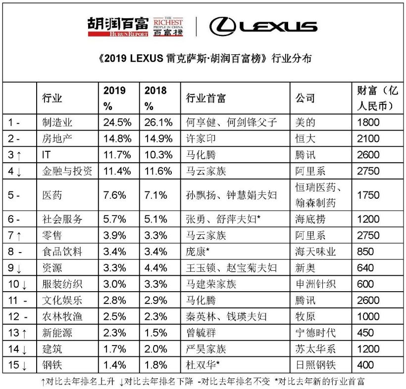 红网时刻10月10日讯(记者 唐瑶)今日,《2019年胡润百富榜》正式出炉,55岁的马云及其家族以2750亿财富第三次成为中国首富;48岁的马化腾财富上涨200亿,以2600亿重返第二;61岁的许家印财富缩水400亿,以2100亿退居第三。 湖南首富:爱尔眼科陈邦 530亿元 居住地为湖南的富豪占据榜单28个席位,其中爱尔眼科陈邦以530亿元成为湖南地区首富,在榜单中排名第47位,较上年排名上升18位;湖南地区进入富豪前一百名的还有三一的梁稳根,以350亿元财富居81位,较上年排名上升29位,及蓝思科技的周群飞、郑俊龙夫妇,以345亿元财富排名第85位。 百富榜中有两张湖南新面孔,为富兴的单海燕,财富40亿元;及三一的易小刚,财富20亿元。 以下为2019胡润百富榜居住地为湖南的富豪名单: 今年是胡润研究院自1999年以来连续第21次发布“胡润百富榜”,上榜门槛连续第七年保持20亿元。上榜企业家财富计算的截止日期为今年8月15日。(财富单位:亿元人民币) 来源:《2019 LEXUS雷克萨斯·胡润百富榜》 财富涨幅最大的是做煤炭的宁夏新首富党彦宝,其他增长较多的还包括:日照钢铁的杜双华、安徽新首富“职业教育大王”新华教育的吴俊保、注射器制造商双鸽的李仙玉家族、VIVO的沈炜和OPPO的陈明永等。 财富缩水最多的是百度的李彦宏、马东敏夫妇,缩水500亿。其他缩水较多的还包括:康美药业的马兴田(缩水351亿)、小米的雷军(缩水350亿)、蔚来汽车的李斌(缩水52%)和分众传媒的江南春(缩水44%)等。 IT行业人数占比从去年10.3%增至11.7%,超越金融投资行业,成为上榜企业家的第三大财富来源。制造业仍是上榜企业家最主要财富来源,但人数占比从去年26.1%降至24.5%;房地产仍排第二,占比14.8%,基本与去年持平;金融投资排名第四,占比从11.6%略降至11.4%;医药仍排第五,从7.1%升至7.6%。 来源:《2019 LEXUS雷克萨斯·胡润百富榜》 156位“80后”上榜,比去年增加24位。其中58位是白手起家的,比去年多8位。浙大校友,拼多多39岁的黄峥财富上涨400亿,以1350亿蝉联“80后”白手起家首富,其次是字节跳动36岁的张一鸣,财富上涨300亿,达到950亿。 11位“90后”上榜,比去年增加1位。其中2位是白手起家的,与去年持平,分别是用户运营服务平台兑吧28岁的陈晓亮和矿机巨头比特大陆股东27岁的葛越晟。陈晓亮是今年新上榜企业家中年龄最小的,他是马云的学弟,毕业于杭州师范大学。 女企业家占比从去年的高峰28.7%回落至27.2%。其中七成是白手起家的。碧桂园38岁的杨惠妍以1750亿财富蝉联中国女首富。 |