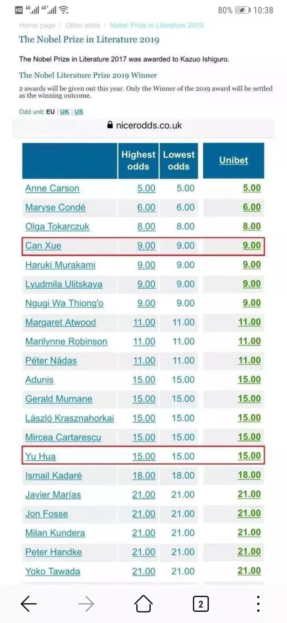 10月10日下午7时,举世瞩目的诺贝尔文学奖揭晓,波兰作家奥尔加·托卡丘克(Olga Tokarczuk)获得了2018年诺贝尔文学奖,奥地利作家彼得·汉德克(Peter Handke)获得了2019年诺贝尔文学奖。 中国作家残雪遗憾落选,但她却因为这件事作品得到了又一次普及。有记者近期走访了一些书店和图书城,发现残雪的著作已一书难求。网上有一套残雪的电子书从31元直接跳涨到79.99元。 有读者读她的书,残雪应该知足了。对她来说,“写”就是意义,几十年来她都是这样过来的,这一次只是在更大的范围内再次证明了她的自信而已。 两年获奖者同时公布引入关注 因为瑞典文学院在2017年卷入一场性丑闻,18名女性于2017年11月出面指证法国籍摄影师阿尔诺在1996年到2017年之间涉嫌性侵、性骚扰,部分事件就发生在归属于瑞典文学院的场所。另外,阿尔诺还泄露获奖者姓名,阿尔诺的妻子正是瑞典文学院院士弗罗斯滕松。 阿尔诺和佛洛斯登松夫妇 瑞典文学院内部对阿尔诺所涉丑闻的处理存在巨大分歧,许多院士纷纷离职,最后学院内能正常履职的院士仅剩10人。受丑闻影响,2018年的诺贝尔文学奖推迟到2019年颁发,这是该奖项自1949年以来首次推迟颁发。这样,今年同时公布2018年和2019年两年的文学奖得主,因而格外引人关注。 中国作家残雪突然大热 每年都有人对那些作家会获奖进行预测,有些机构和媒体预测得奖者的概率,叫大众去竞猜。比如说,A得奖的赔率是1赔2,投注100元,如果真的得奖了,主办方返还200元。今年加拿大女诗人安妮·卡森、日本作家村上春树、叙利亚诗人阿多尼斯、肯尼亚作家恩古吉·瓦·提安哥、俄罗斯女作家柳德米拉·乌利茨卡娅等都是热门人选。 10月6日,英国著名的博彩公司NicerOdds给出的2019年文学奖预测名单。 今年有个特别的现象,10月6日,英国著名的博彩公司NicerOdds给出的2019年文学奖预测名单中,残雪、余华、杨炼3位中国作家上榜。其中,残雪与村上春树(可怜的村上先生,常年位于诺贝尔文学奖各大赔率榜的前列,却从未得奖,被戏称为“万年陪跑”)并列第四,成为中国最被看好的诺贝尔文学奖提名人选。这位不大有读者的中国作家残雪,一下子跳到了人们的眼前,上了热搜。 残雪近照 残雪是谁? 就像得知某个人中了头彩,人们纷纷打听这位幸运者是谁。 青年时代的残雪 其实,残雪在上世纪80年代与马原、洪峰、余华、苏童、叶兆言等作家同时成名,是位名符其实的先锋派老作家。 1989年版 《天堂里的对话》这是残雪在国内出版的第一部短篇小说集。 摘一段公开资料:残雪本名邓小华,1953年生于长沙。1985年1月,首次发表小说《山上的小屋》,至今已有六百万字作品。其代表作有《山上的小屋》《黄泥街》《苍老的浮云》《五香街》《最后的情人》等。目前残雪是唯一获得美国最佳翻译图书奖的中国作家,获得英国独立报外国小说奖提名,入围国际布克奖长名单,入围美国纽斯塔特国际文学奖短名单。欧美、日本知名评论家对她的作品不吝赞美之词。日本还成立了残雪研究会,创办了《残雪研究》杂志。 残雪的回应 深居简出不大参加文学界活动的残雪大概受到了骚扰,她通过湖南文艺出版社官方微博回应登上诺贝尔文学奖赔率榜。她说:“国内的朋友太重视这个奖了,这只是一个奖,又还没有得,不必都来找我。入围跟得奖之间还差得远。这个奖的结果有成千上万的可能性,目前是预料不到的。对于此次的入围,我很高兴。这说明诺贝尔文学奖的评委比以前开放,开始重视高层次的纯文学。” 自动播放