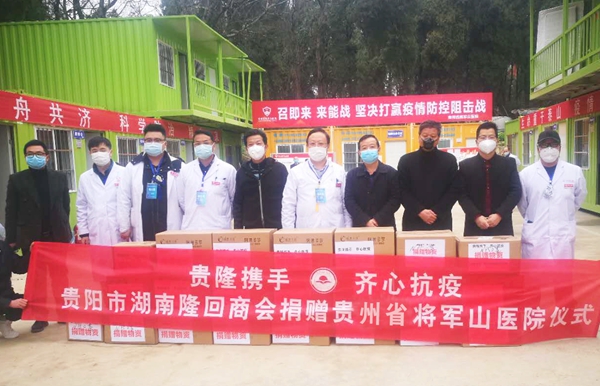 (盛世湘黔网)贵隆携手,齐心抗疫。2月21日,在全国上下合力抗击新型冠状病毒感染肺炎疫情的关键时刻,贵阳市湖南隆回商会在贵阳市工商联的倡导下,通过省红十字会向贵州省将军山医院捐赠价值11.58万元的N95进口医用口罩和金银花益生菌给战斗在抗疫一线的医护人员。 当天下午,贵阳市湖南隆回商会会长肖升建、商会总顾问、省政协委员肖升干、秘书长罗文骅,执行秘书长郭秀武满载千里之外运来的15箱湖南隆回金银花益生菌和500个进口N95医用口罩送到位于贵阳市花溪区的贵州省将军山医院,贵阳市工商联副主席梁鹤林、政策研究室主任刘胜莅临捐赠现场。