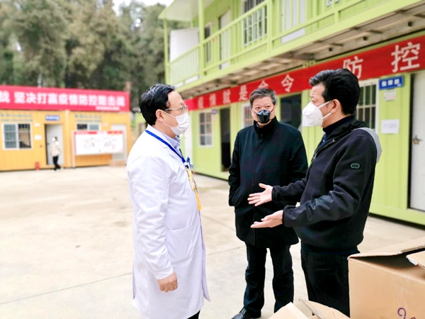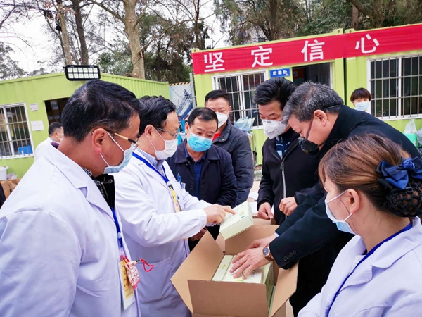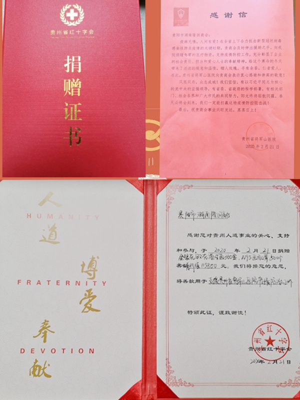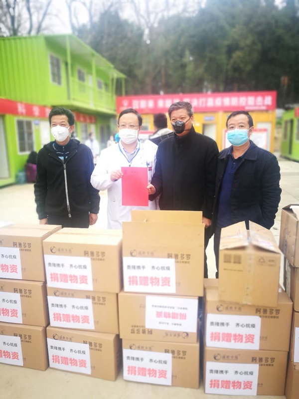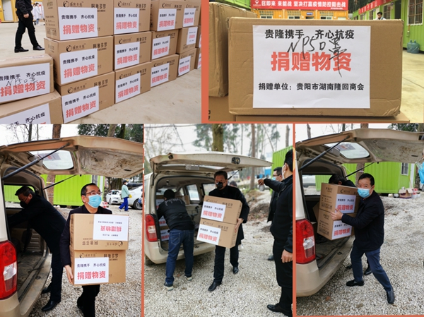 (贵阳市湖南隆回商会捐助的金银花益生菌受到将军山医院后勤处处长张谦教授等专家热议) (将军山医院后勤处处长张谦教授(左二)代表医院致感谢信,左一贵阳市湖南隆回商会总顾问肖升干、右二贵阳市湖南隆回商会会长肖升建、右一贵阳市工商联副主席梁鹤林) 将军山医院后勤处处长张谦教授(上图左二)代表医院对隆回商会的大爱善举表示衷心感谢。他表示,疫病无情,人间有爱,贵阳市湖南隆回商会及时伸出援助之手捐赠难得可贵的传统中药材金银花益生菌产品和优质医用口罩给一线医护人员,彰显了商会的社会责任和商会爱心人士的奉献精神,带来浓浓暖意和温情,相信有党中央的领导,有省委省政府的科学部署,相关部门、社会各界和广大市民的共同努力,阳光终将驱散阴霾,春天必将到来,我们一定能打赢这场疫情防控阻击战。 贵阳市工商业联合会副主席梁鹤林曾多次出席指导商会工作和慈善捐赠活动,他对商会积极响应省委省政府、市委市政府、市委统战部和工商联号召支持抗疫行动给予充分肯定,并对战斗在一线的将军山医院的医护人员表示慰问。他表示,新型冠状病毒感染的肺炎疫情发生后,贵阳市工商联认真贯彻习近平总书记对新型冠状病毒感染的肺炎疫情的重要指示和贵州省委省政府、贵阳市委市政府的工作部署,充分发挥职能作用,相继向各区(市、县)工商联和市属商会及会员企业发出倡议书,积极动员和引导民营企业家弘扬一方有难、八方支援的中华民族的传统美德,承担社会责任,得到各个商会的热烈支持,纷纷以实际行动支援抗击新型冠状病毒感染的肺炎疫情。 去年12月以来,新型冠状肺炎病毒来势汹汹,肆虐侵袭国人,贵阳市湖南隆回商会同仁们看在眼里,急在心里,为响应市委、市政府、市委统战部和工商联的号召,在会长肖升建和党支部的倡导下,得到了总顾问肖升干、执行会长周英球、陈彦、陈志鹏、党支部书记刘玉林、常务副会长周乐刚、副会长李健、肖林鹏等班子成员、欧阳东升、李顺湘等顾问、秘书处及袁凯辉、刘松涛、聂青林、刘喜万等商会理事会员的大力支持和热力捐助。在秘书处的积极推动下,500元、1000元、5000元乃至20000元,爱心不分大小,涓涓细流汇聚成爱之河......班子成员带头,理事会员纷纷响应,短短两天之内迅速凑集了募捐款项。