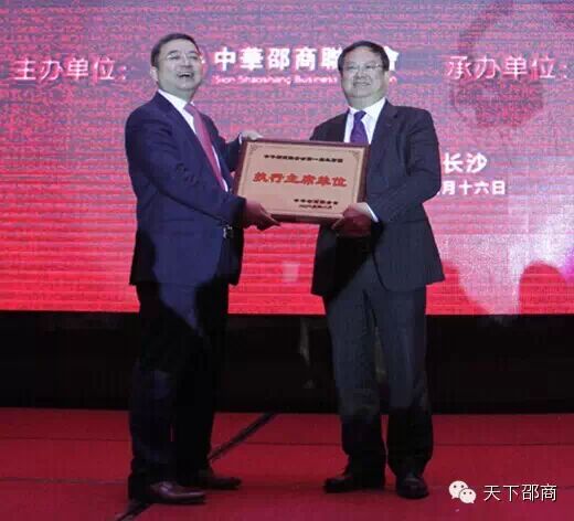 2015年1月16日,中华邵商联合会2015迎新年会在长沙凯宾斯基酒店隆重举行。来自全国36家邵阳商会、宝庆商会的代表400余人欢聚一堂,共叙乡情,共话未来。湖南省原人大副主任唐之享,湖南省经协办副主任祝拥军,湖南省异地商会联络处长李林刚,邵阳市人民政府副市长赵为济,邵阳市政协副主席肖益林,邵阳市人民政府副秘书长王成章,邵阳市商务局副局长曾小鸣等领导出席本次大会。 从2014年1月8日成立至今,经过一年的发展与沉淀,中华邵商联合会的各项工作取得了丰硕的成果,受到社会各界广泛关注和赞誉。 作为本次大会的承办方,中华邵商联合会常务主席、金桥国际市场集群董事长傅胜龙先生发表了热情洋溢的讲话,他表示我们因邵阳而结缘,因资水而相聚,我们要合作、创新、共赢。他介绍金桥国际占地8平方公里,我们在创造一个新的城市,创造一个值得邵商骄傲的作品,希望邵商们共同参与,成为金桥国际的股东,成为一家人。 邵阳市副市长赵为济致辞表示:邵阳人杰地灵,邵阳人凭着勤劳勇敢、凭着聪明智慧、凭着忠厚善良,邵商们在各领域都取得可喜成绩。邵阳市委市政府一直把支持天下邵商的发展当成最重要的工作!我们的家乡邵阳在全省还相对落后,有赖于我们在外邵商的成功人士关注邵商的发展,为家乡的发展出谋划策,为邵阳湘商产业园的发展做一些实实在在的事情,热情欢迎邵商回乡投资兴业,我们将为大家做好服务工作。 会上,中华邵商联合会主席张辉先生做了《中华邵商联合会2014年工作报告》,总结2014年的工作与取得的成绩,对2015年提出五个新:新常态、新机遇、新挑战,新思路、新发展。他期望邵商们在思想上要有高度,在眼界上要有宽度,在胸怀上要有广度,大家团结起来,共同发展,回报家乡。中华邵商联合会执行主席邓天骥先生做了2015年工作规划执行说明,描绘联合会美好蓝图,务实做好各项工作,让联合会真正成为天下邵商的家,共同开创辉煌灿烂的明天。 随后,中华邵商联合会秘书长赵志刚主持了中华邵商联合会组织机构授牌仪式、中华邵商联合会各隶属机构成立及授牌仪式。 秘书长赵志刚首先宣布了第一届主席团第三次会议上对联合会的组织架构调整结果: 一、将联合会主席轮值制改为任期制,主席团一致推选张辉先生为联合会第一任主席。 二、在联合会增设执行主席一名,主席团一致推选邓天骥先生为执行主席。 三、主席团一致批准通过唐未德先生为监事会主席。 四、增补北京市邵阳企业商会会长刘尧先生为常务主席。 五、今年新成立的邵阳商会有南宁市邵阳商会、昭通市湖南商会、惠州市邵阳商会、柳州邵阳商会、江门市湖南邵阳商会、清远市邵阳商会,根据联合会章程规定,各地新成立的邵阳商会自愿申请缴纳会费之后自动加入联合会成为主席团副主席单位,以上单位会长汤献华、胡远智、王桂中、唐光明、刘飞兵、彭少堂增补为中华邵商联合会副主席。湾田集团有限公司董事长刘祖长自愿申请加入中华邵商联合会,经主席团批准,成为联合会第一个邵商企业理事会员,并被一致推举为副主席单位。 联合会终身名誉主席曾小山先生给联合会主席张辉授牌: